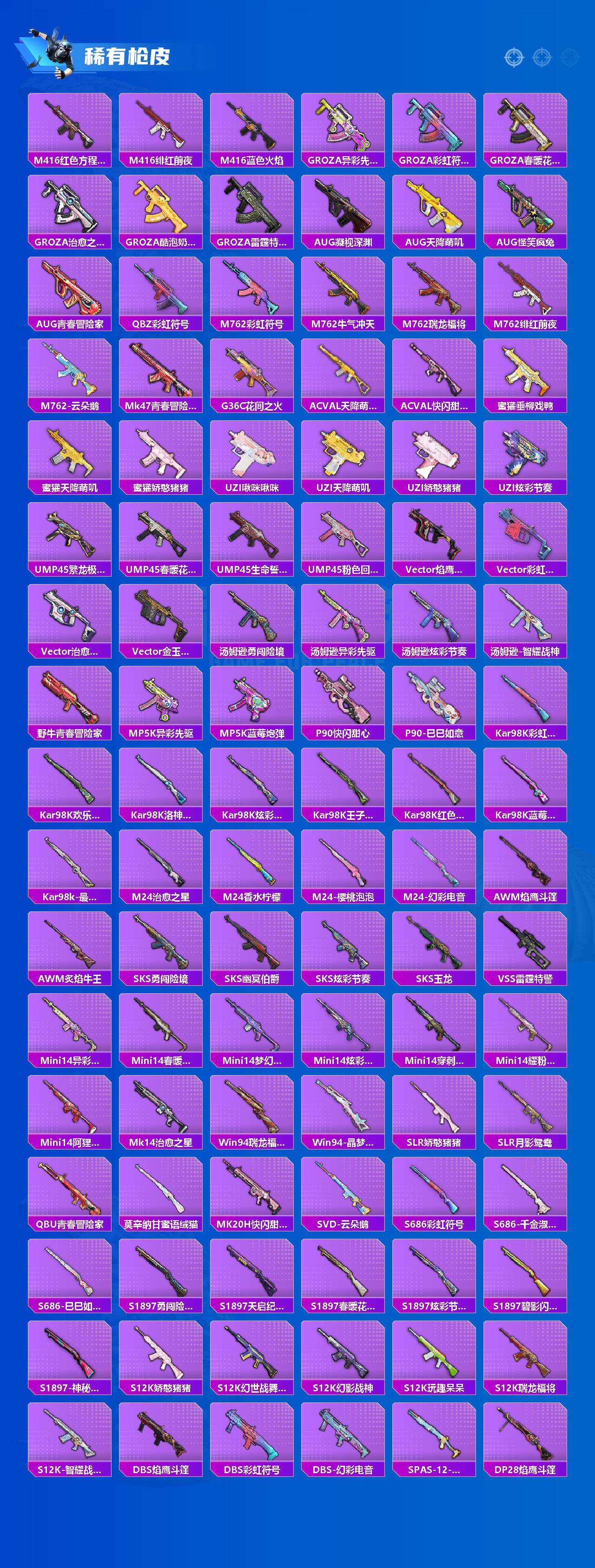 【粉色枪皮等级】:SCAR-L-锦绣绵绵(五级),M416-风花雪月(七级),AUG-暖羊咩咩(五级),Vector-最终圣卫者(三级