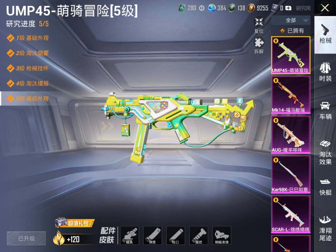 【粉色枪皮等级】:AKM-梦之光华(七级),SCAR-L-锦绣绵绵(五级),AUG-暖羊咩咩(五级),UMP45-萌骑冒险(五级),Kar98K-巳巳如意(五级),Mk14-福马献瑞(