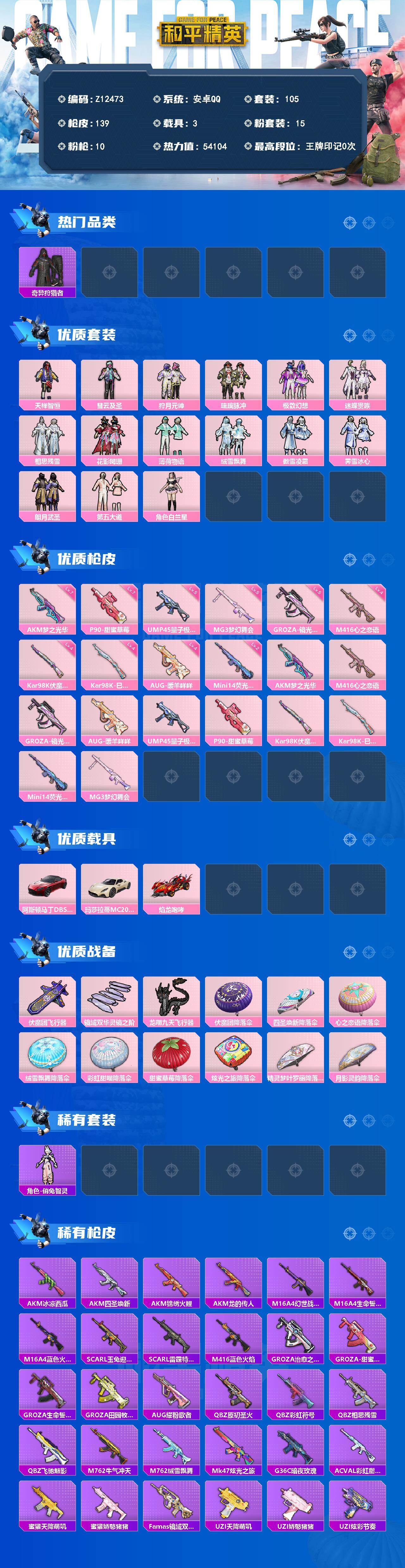 安卓 手Q-15粉装-10特效枪-3载具-3粉色飞行器-54104热力值-1王牌印记-105套装-139枪皮