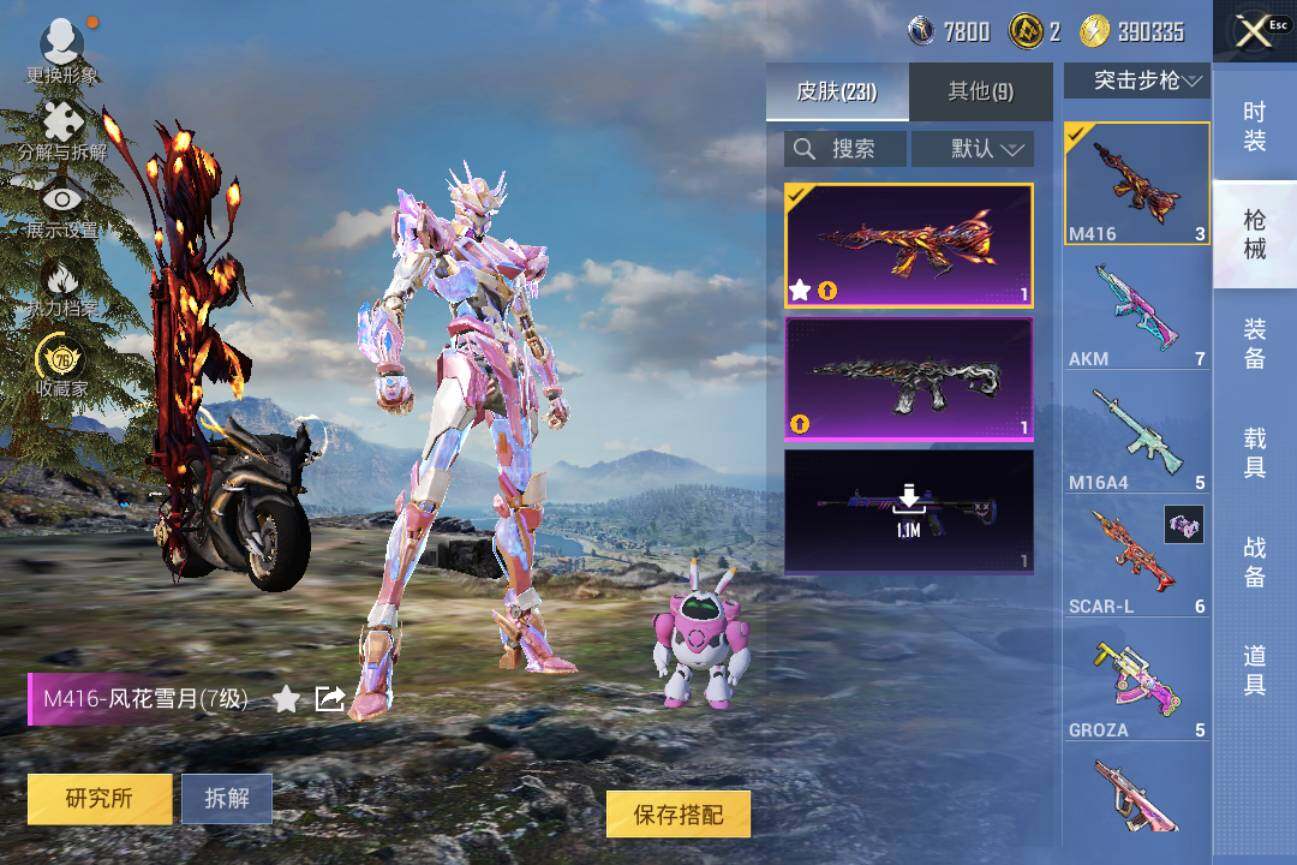 1神装-11粉装-13特效枪-4载具-8粉色飞行器-89498热力值-6王牌印记-183套装-231枪皮