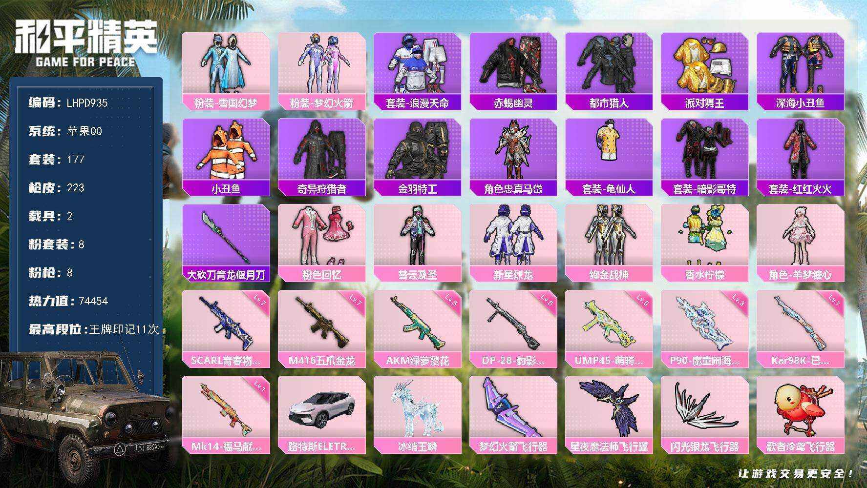 【极品素材号/雪国/都市/舞王/赤蝎/哥特/天命/新火箭】苹果 手Q-8粉装-8特效枪-2载具-6粉色飞行器-74454热力值-11王牌印记-177套装-223枪皮【热门品类】:粉装-雪国幻梦,粉装-梦幻火箭,套装-浪漫天命,套装-赤蝎幽灵,套装-都市猎人,套装-派对舞王,套装-深海小丑鱼,套装-小丑鱼,套装-奇异狩猎者,套装-金羽特工,角色-忠真马岱,套装-龟仙人,套装-暗影哥特,套装-红红火