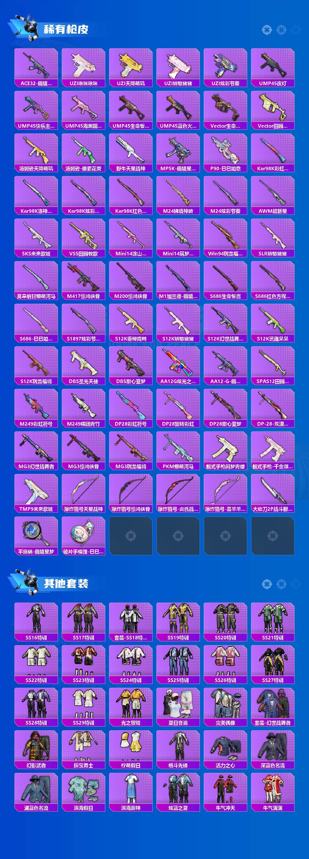 【粉色枪皮等级】:AKM-绿萝繁花(五级),M416-风花雪月(七级),AKS-74U-森灵之息(五级),P90-能量风暴(七级),Kar98K-巳巳如意(五级),Mk14-福马献瑞(五级),DP-28-豹影疾电(五级