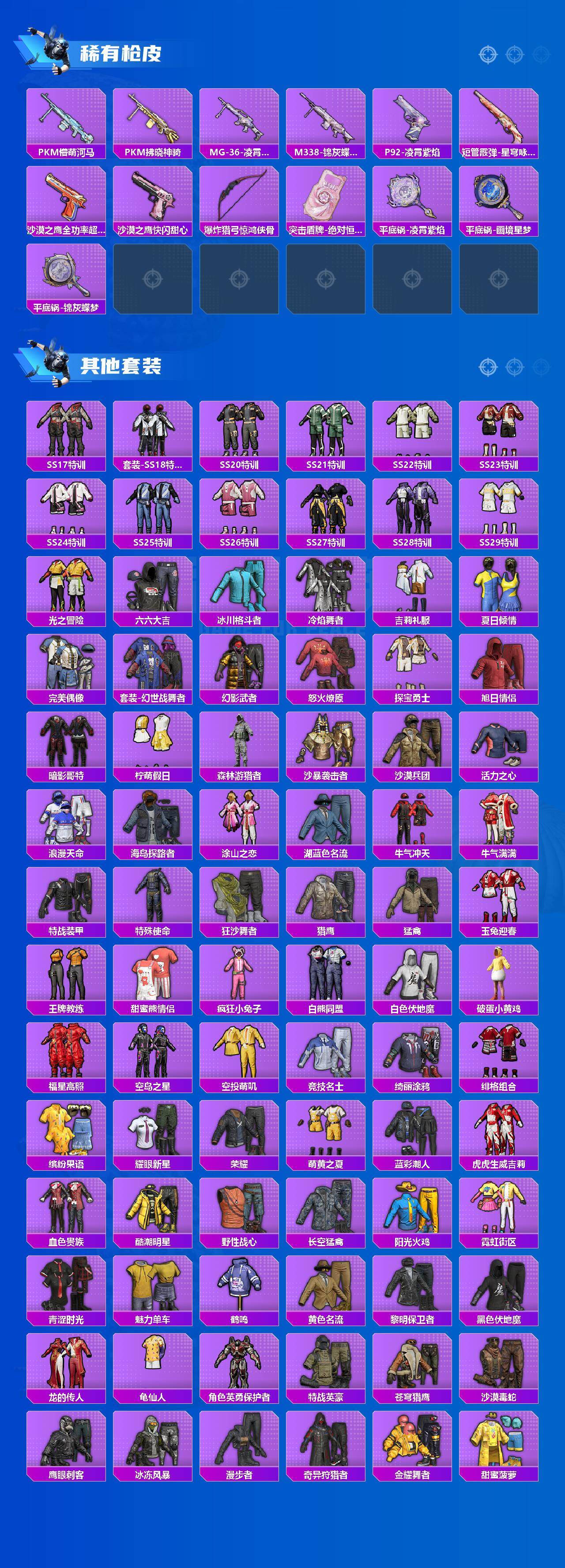 苹果 【素材号 套装-都市猎人/套装-冥河战士/套装-深海小丑鱼/套装-暗影哥特/角色-Mark.06/SCAR-L-青春物语(七级)/ACE32-萌骑漫游(三级)/Kar98K-创世·救赎(七级)/宾利欧陆GT敞篷(火焰橘)/深海小丑鱼背包】手Q-4粉装-9特效枪-2载具-3粉色飞行器-77423热力值-18王牌印记-187套装-248枪皮