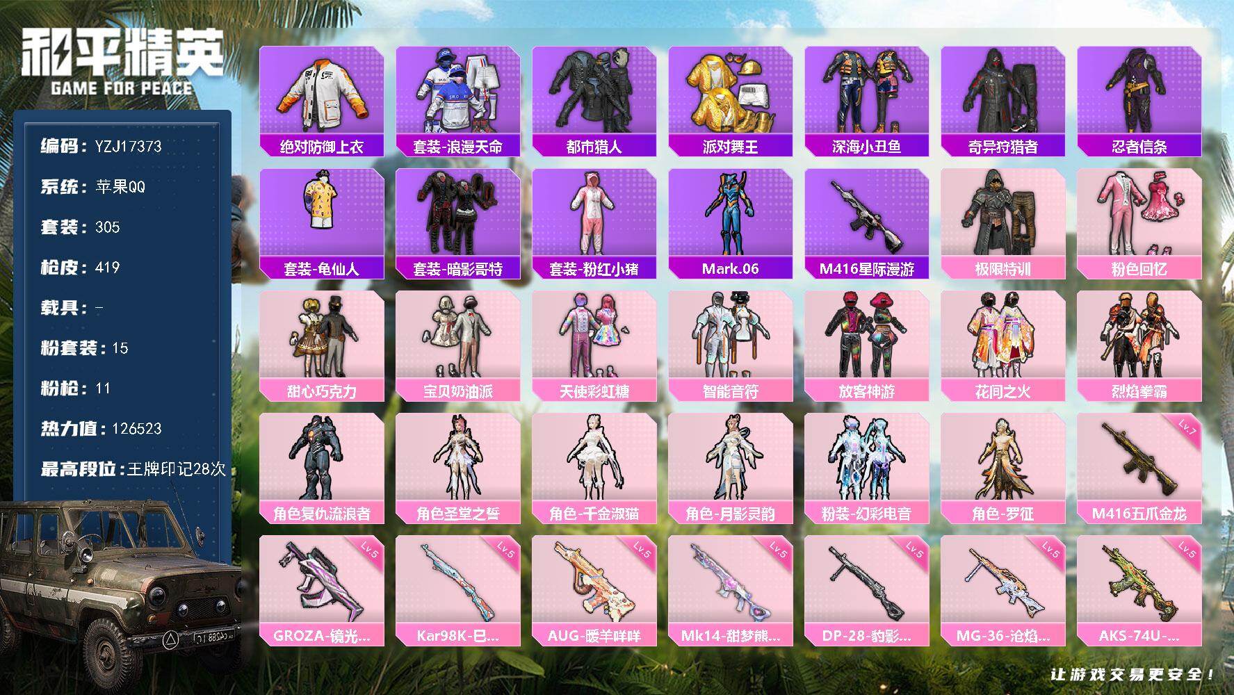 2581801_实名可改-苹果Q-11稀有15粉装11特效枪26热门305套装419枪皮126393热力值极品精氪身法号200多天特权卡M4星际漫游巧克力三姐妹千金淑猫圣堂之誓和服智能音符都市金鞋巡查衣红眼罩奇异狩猎者蓝螳螂深海小丑鱼青涩年华鲨鱼服忍者信条天命满级M4五爪3级维克多最终圣卫者28印记历史绝世王牌25星【11稀有】奇异狩猎者巡查衣M416-黄金龙骨AWM-黄金龙骨M416-星际漫游A