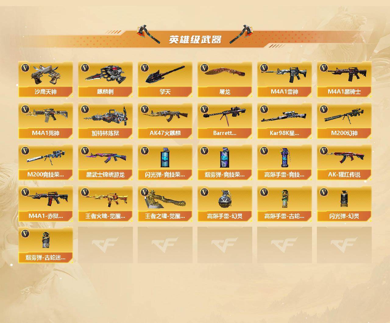 【热门武器】:传说圣灵,传说幽瞳,QBZ03-金色蔷薇,M200-幻神,金色蔷薇-古蛇迷踪,修罗-古蛇迷踪,M200-竞技荣光,死亡之眼,Kar98K-星神,M4A1-黑骑士,加特林-炼狱,金刚伞