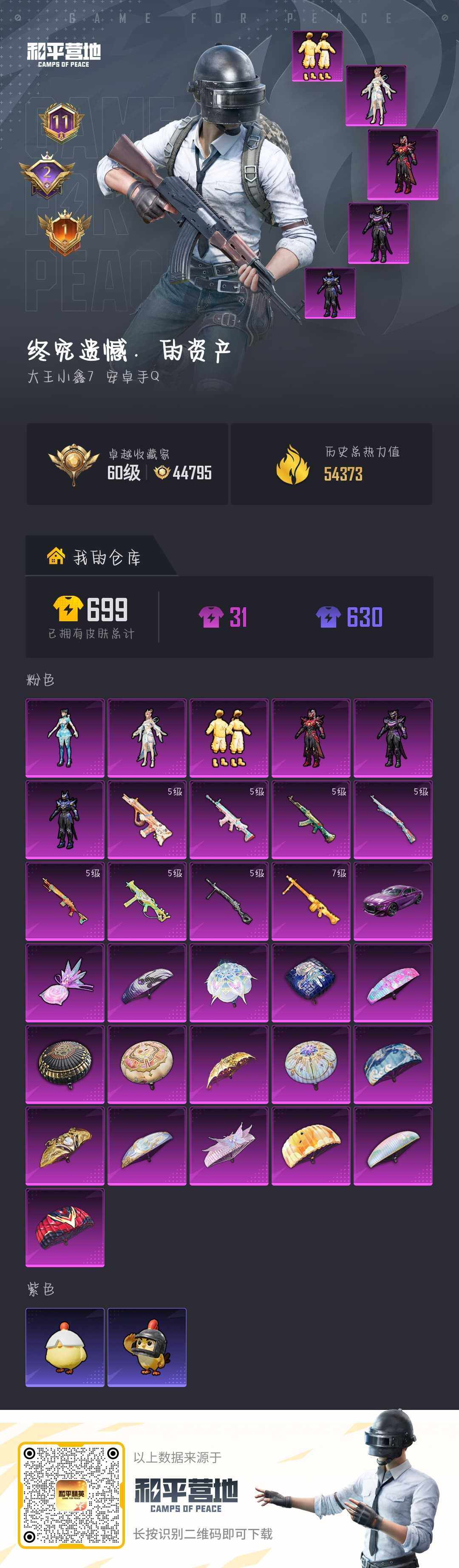 安卓 手Q-6粉装-8特效枪-1载具-1粉色飞行器-54373热力值-11王牌印记-132套装-210枪皮【热门品类】:套装-深海小丑鱼,套装-忍者信条,套装-龟仙人【粉色套装】:角色-万古烈焰,角色-宙之时溯,角色-星云暗核,粉装-暖暖奶龙,角色-月影灵韵,角色-异瞳寒姬【粉色枪皮等级】:AKM-绿萝繁花(五级),SCAR-L-锦绣绵绵(五级),AUG-暖羊咩咩(五级),UMP45-萌骑冒险(
