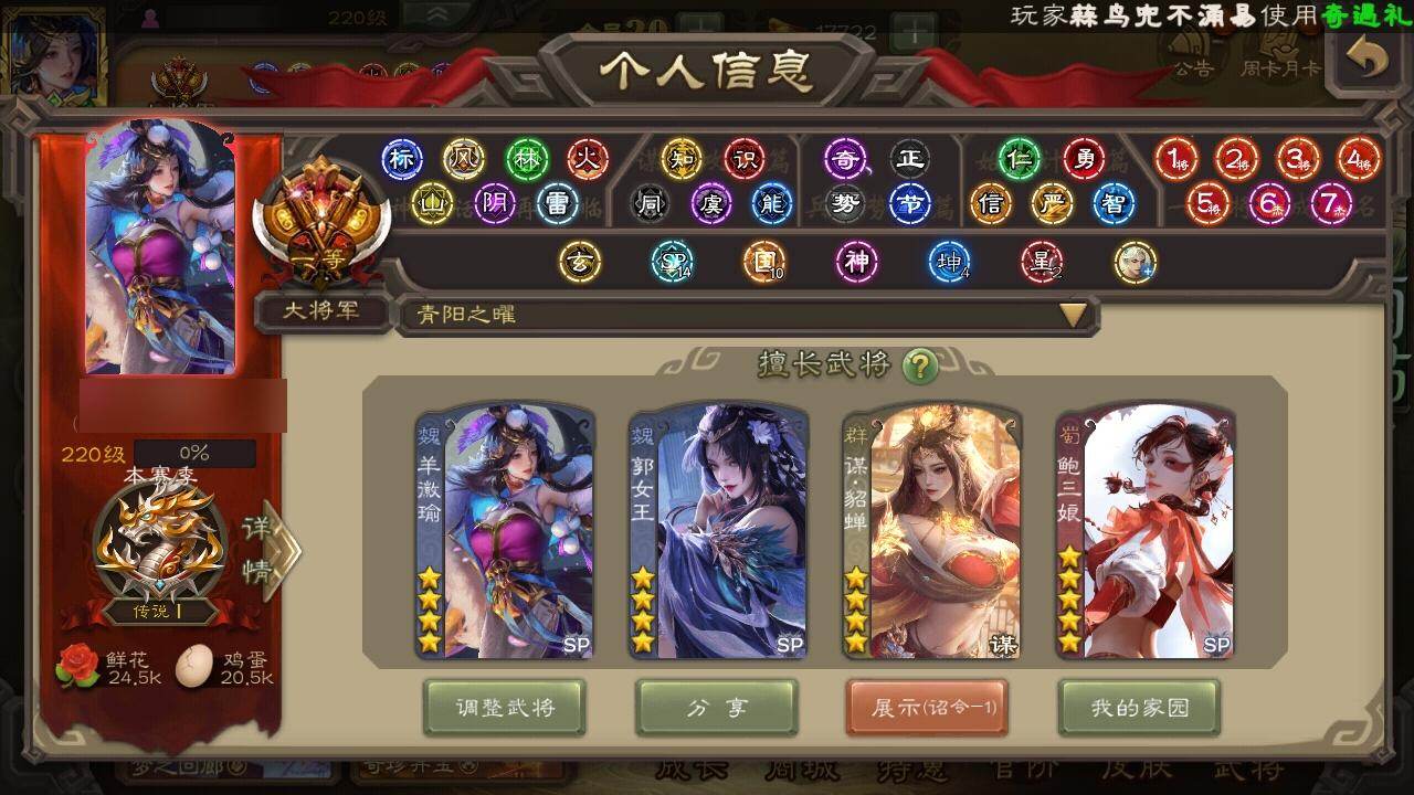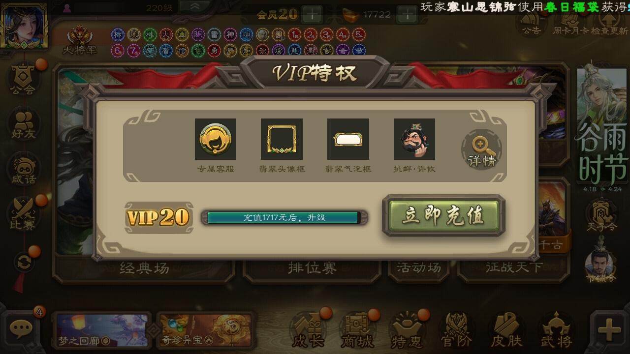 官阶:大将军;VIP等级:VIP20;史诗武将数量:138;动态皮肤数量:18