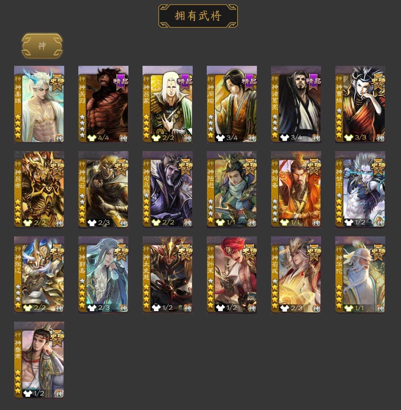 神曹操,神吕布,神赵云,神司马懿,神陆逊,神刘备,神甘宁,神张辽,神郭嘉,神太史慈,神孙策,神荀彧,神华佗,神诸葛亮,神鲁肃,神姜维,SP司马昭,曹髦,郭女王,星周