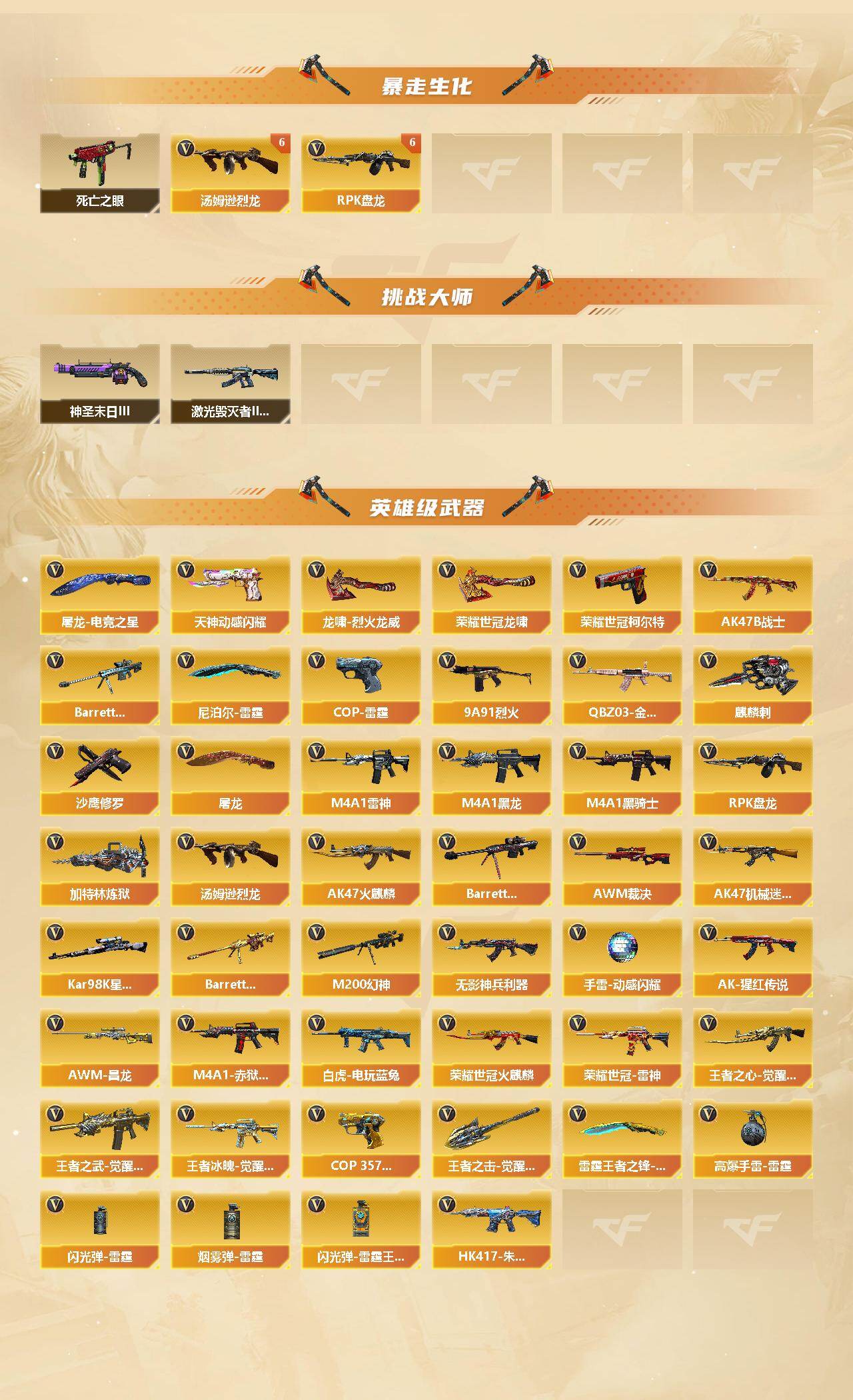 【热门武器】:QBZ03-金色蔷薇,M200-幻神,死亡之眼,荣耀世冠-火麒麟,荣耀世冠-雷神,白虎-电玩蓝兔,荣耀世冠-柯尔特*2,Kar98K-星神,M4A1-黑骑士*2,汤姆逊-烈龙*6,RPK-盘龙*6,加特林-炼狱*2,斯泰尔-蝴蝶,降世魔童,毁灭-孙三炮,沙鹰-修罗*4,荣耀世冠-龙啸*2