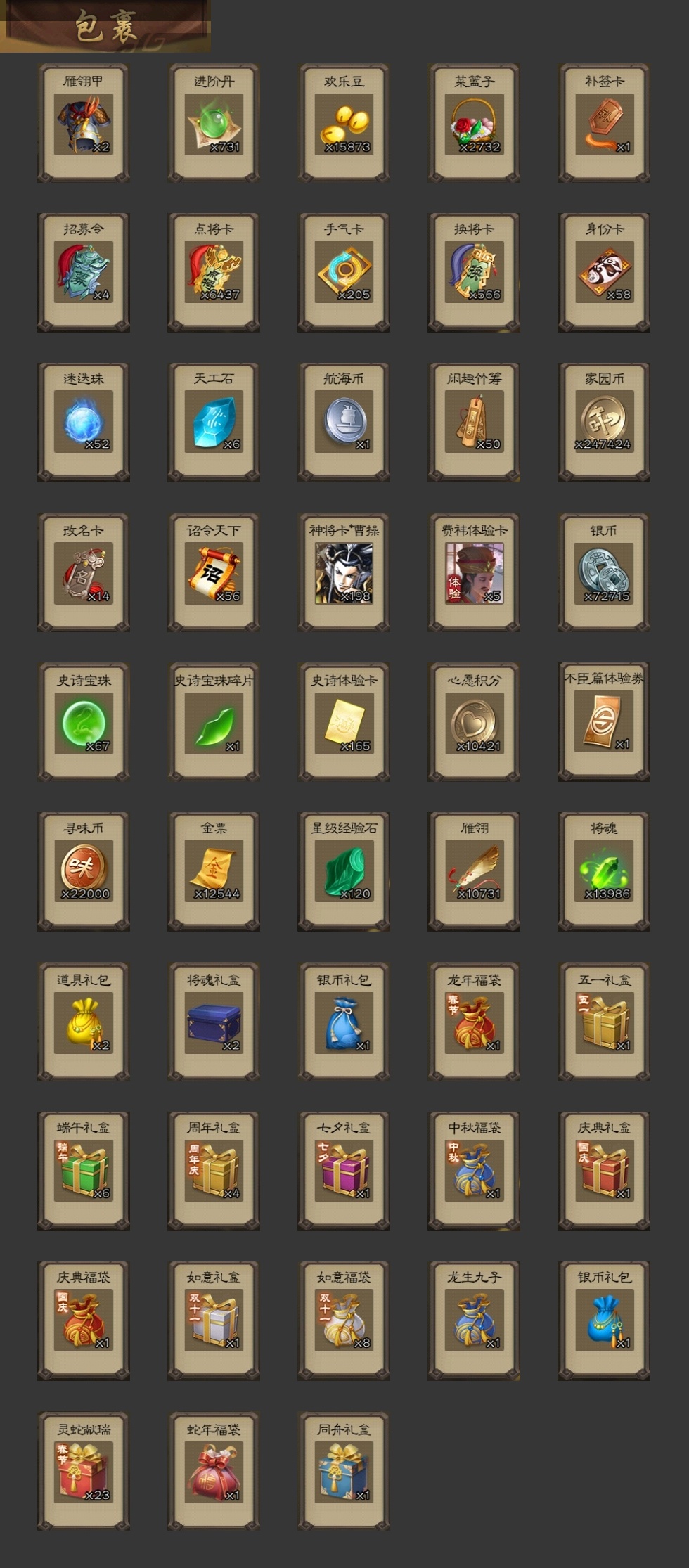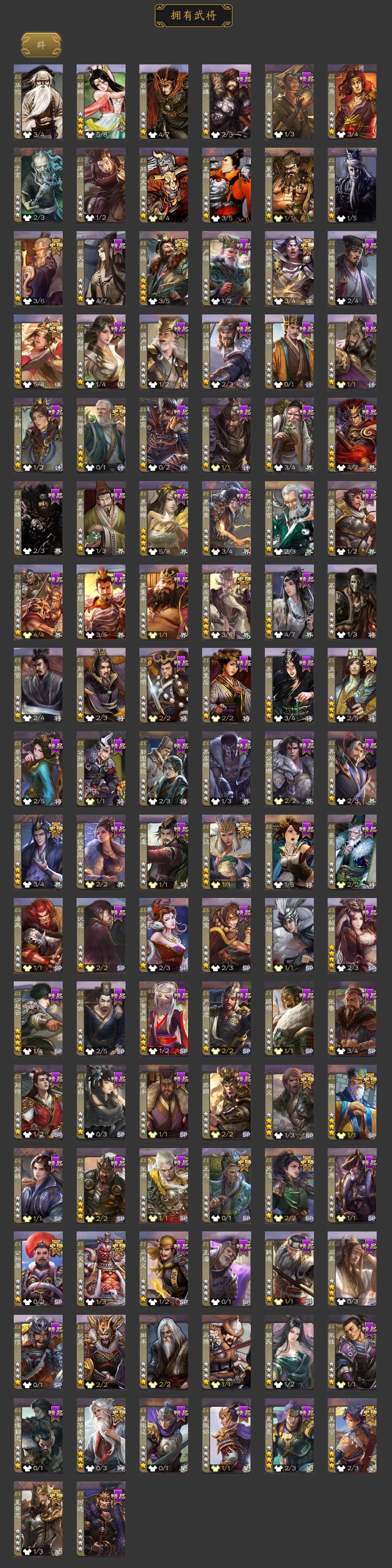 VIP等级: VIP12 官阶: 大将军 武将数量: 407 动态皮肤数量: 92 神将: 神甘宁,神郭嘉,神刘备,神陆逊,神太史慈,神张辽,神赵云,神吕蒙,神周瑜,神诸葛亮 魏国武将: 戏志才,曹纯,陈琳,程昱,郝昭,界曹真,界于禁,界钟会,文鸯,王粲,张昌蒲,唐咨-魏,张辽,SP蔡文姬,SP曹仁,SP关羽,SP贾诩,SP姜维,SP庞德,卞夫人,蔡贞姬,曹昂,曹操,曹冲,曹洪,曹丕,曹仁,曹叡