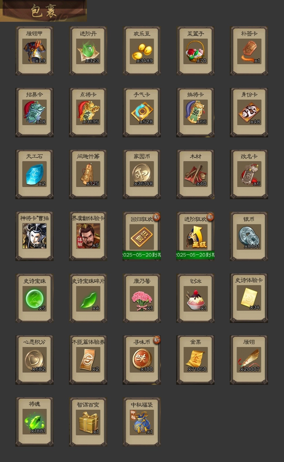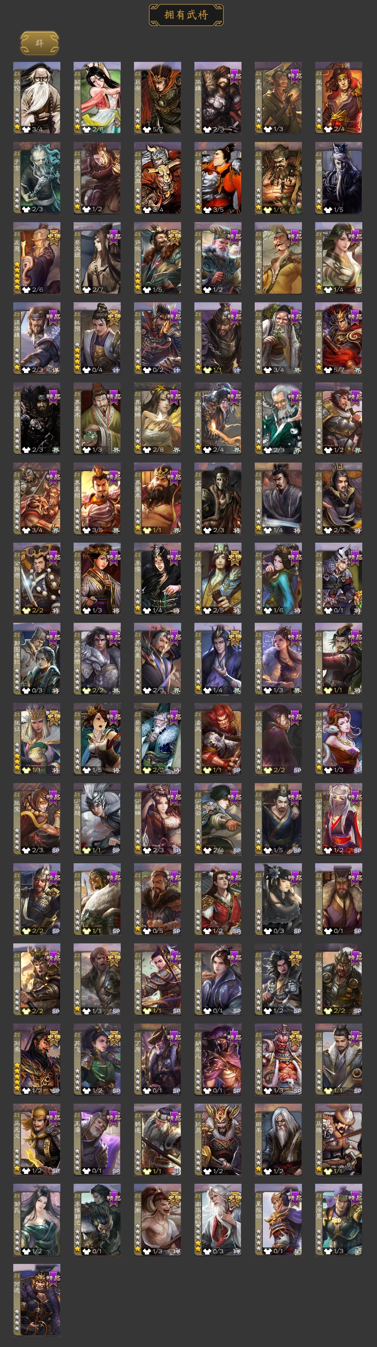 VIP等级: VIP10 官阶: 大将军 武将数量: 355 动态皮肤数量: 41 神将: 神吕布,神太史慈,神赵云,神吕蒙,神周瑜,神诸葛亮,神鲁肃 魏国武将: 戏志才,曹纯,陈琳,程昱,嵇康,界曹真,界钟会,杨修,唐咨-魏,张辽,SP蔡文姬,SP曹仁,SP关羽,SP贾诩,SP姜维,SP庞德,卞夫人,曹昂,曹操,曹冲,曹洪,曹丕,曹仁,曹叡,王异,张恭,鲁芝,界满宠,曹休,界曹植,满宠,荀攸,