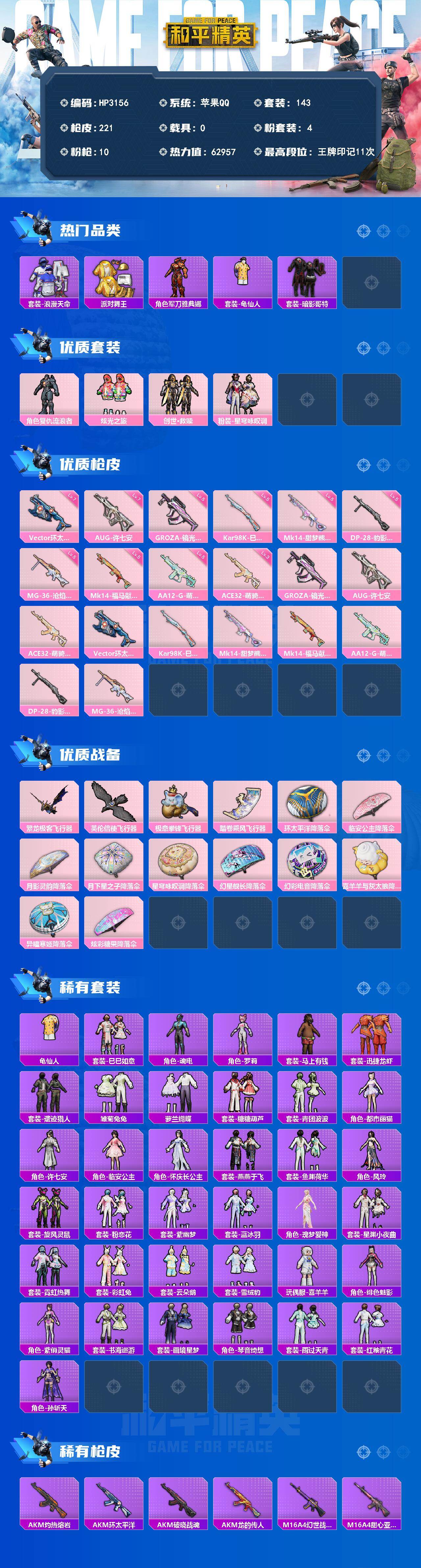 【HP3156】143套装/枪械10/装备280/战备151/王牌印记11/热力值62957/五级GROZA-镜光银凌/七级AUG-许七安/三级ACE32-萌骑漫游/七级Vector-环太平洋/五级Kar98K-巳巳如意/五级Mk14-甜梦熊击/五级Mk14-福马献瑞/五级AA12-G-萌骑幻想/五级DP-28-豹影疾电/五级MG-36-沧焰双生/套装-浪漫天命/套装-派对舞王/角色-军刀雅典娜/套装-龟仙人/套装-暗影哥特/角色-复仇流浪者/粉装-炫光之旅/套装-创世·救赎/粉装-星穹咏叹调/