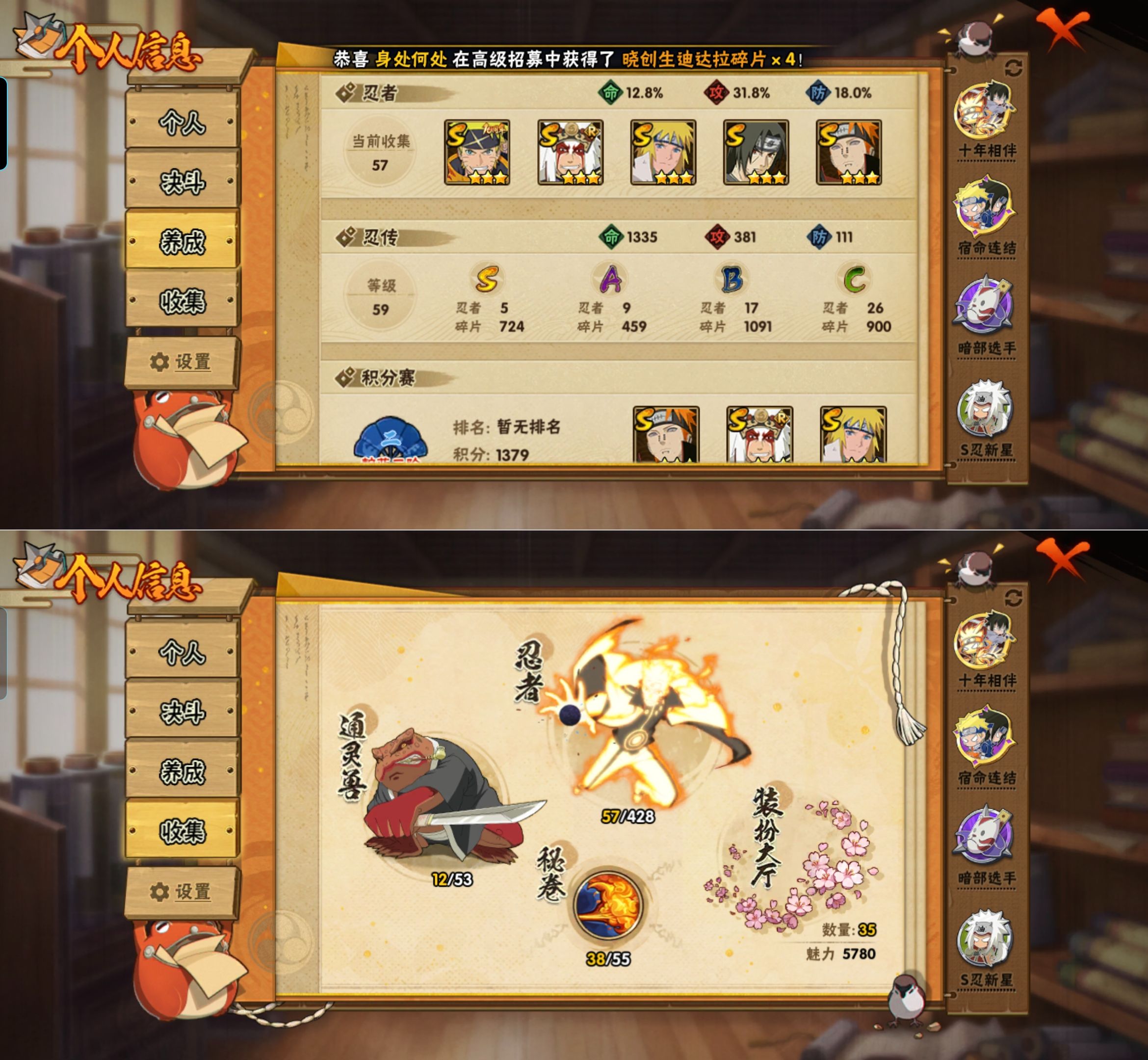MHY4062有二次 【区服】3698【等级】131【S级数量】5【A级数量】9【B级数量】17【C级数量】26【S级】宇智波鼬「须佐能乎」 漩涡鸣人·宇智波佐助 自来也「舞之豪杰」 波风水门 佩恩「天道」