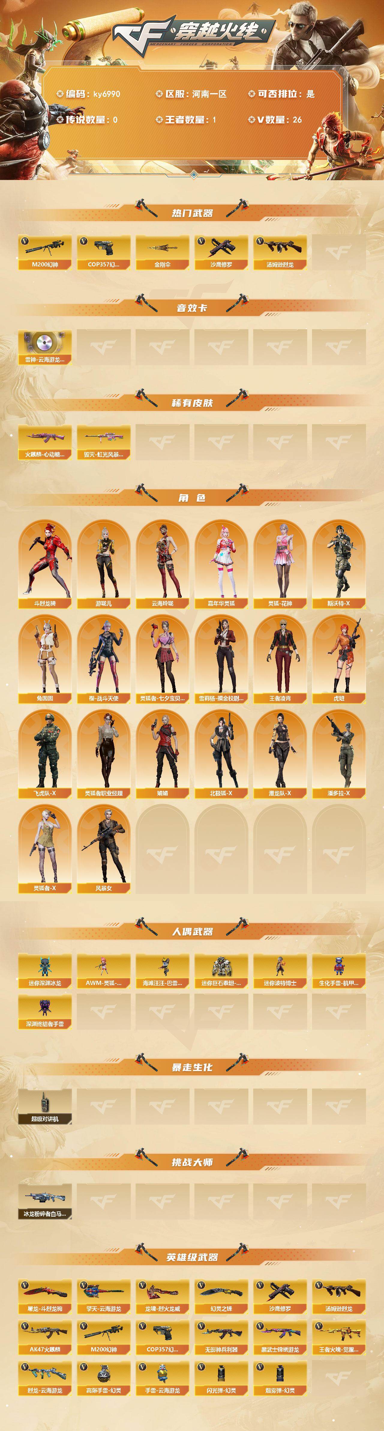 河南一区-28V-1王者武器数-0炫金武器数【热门武器】:M200-幻神,