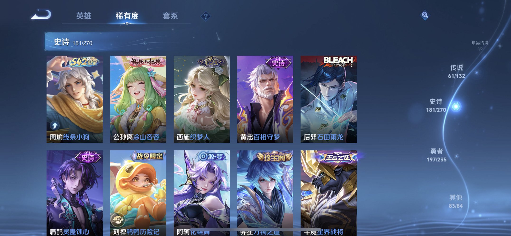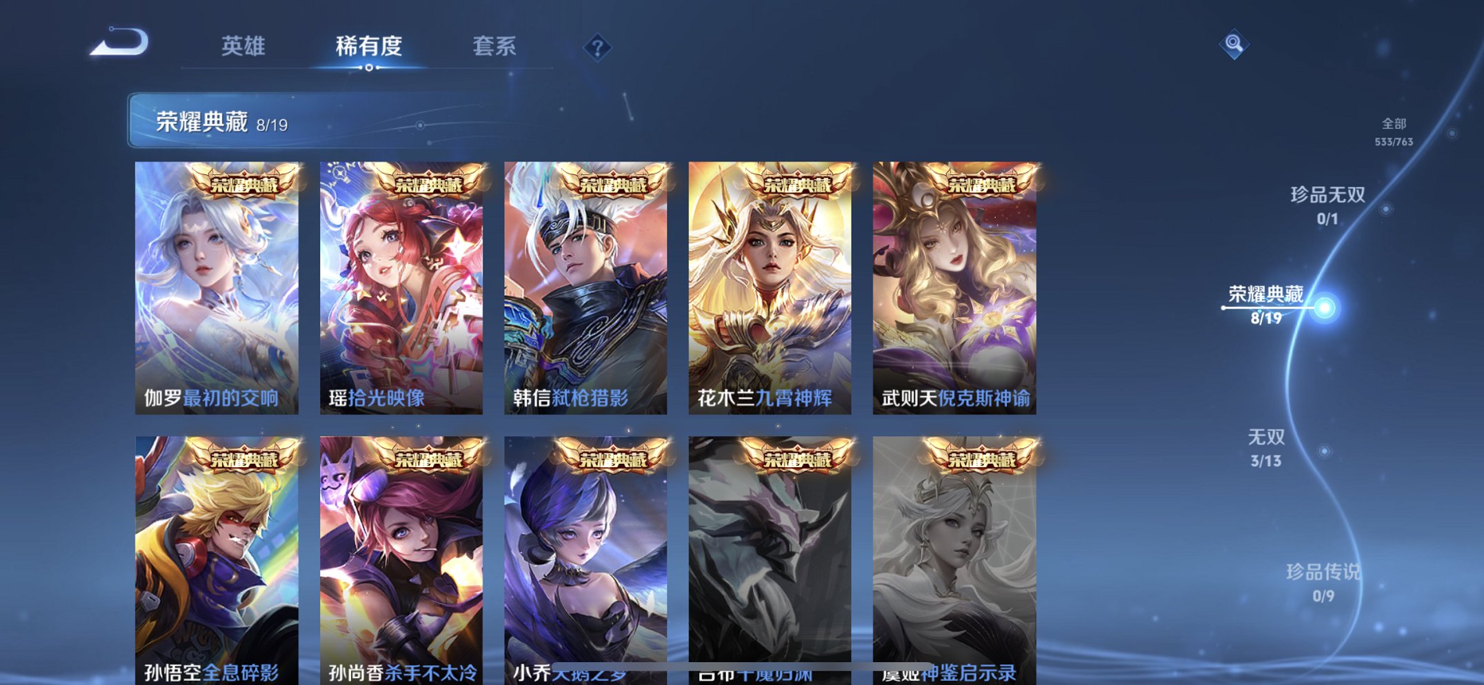 【V10 533皮肤9水晶3无双61传说5星元1天幕5金标猴子吕布孙尚香万战阿珂