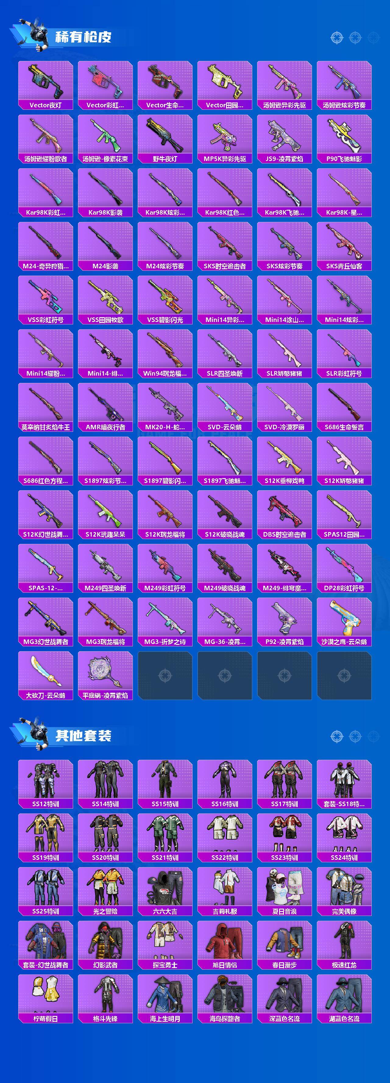 【粉色枪皮等级】:Kar98K-巳巳如意(五级),Mk14-福马献瑞(五级),MK12-雪月幻音(五级),DP-28-豹影疾电(五级)