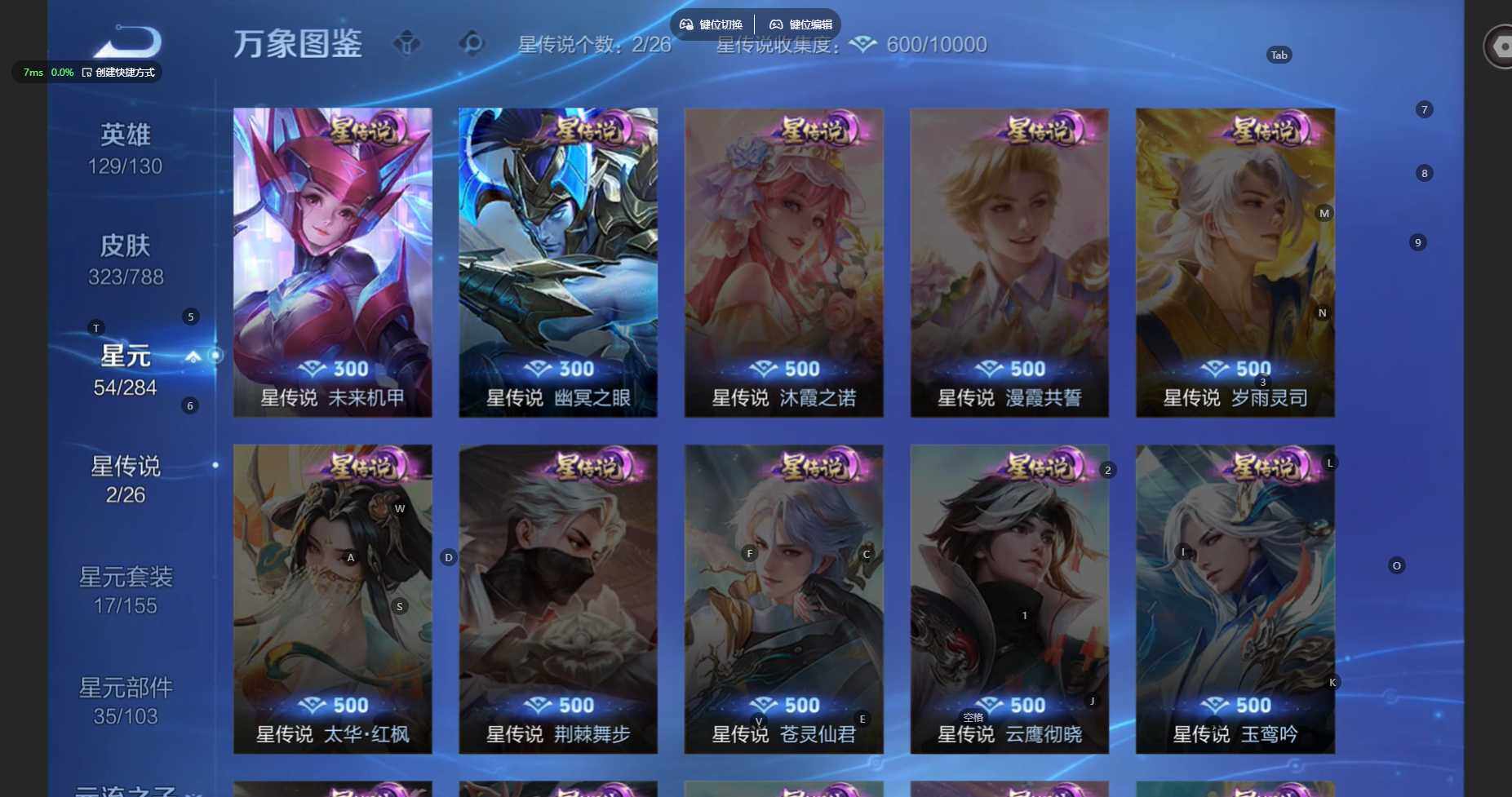 苹果Q-V7-最强王者段位-129英雄-323皮肤-3典藏皮肤-1无双-11传说-95史诗