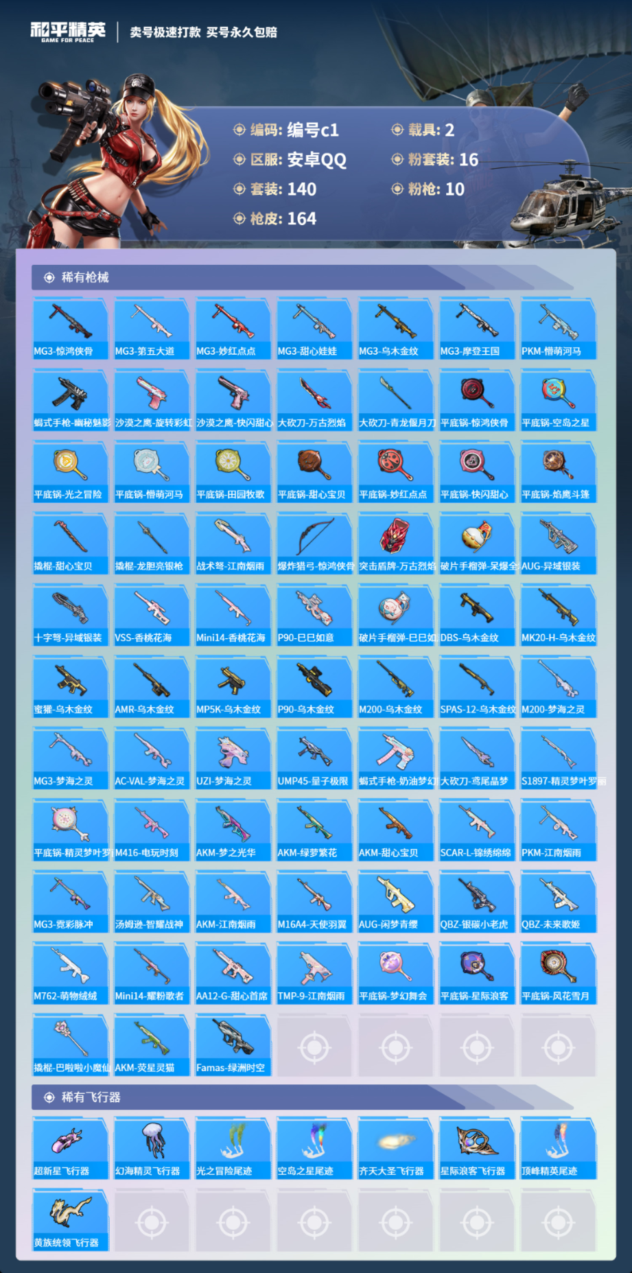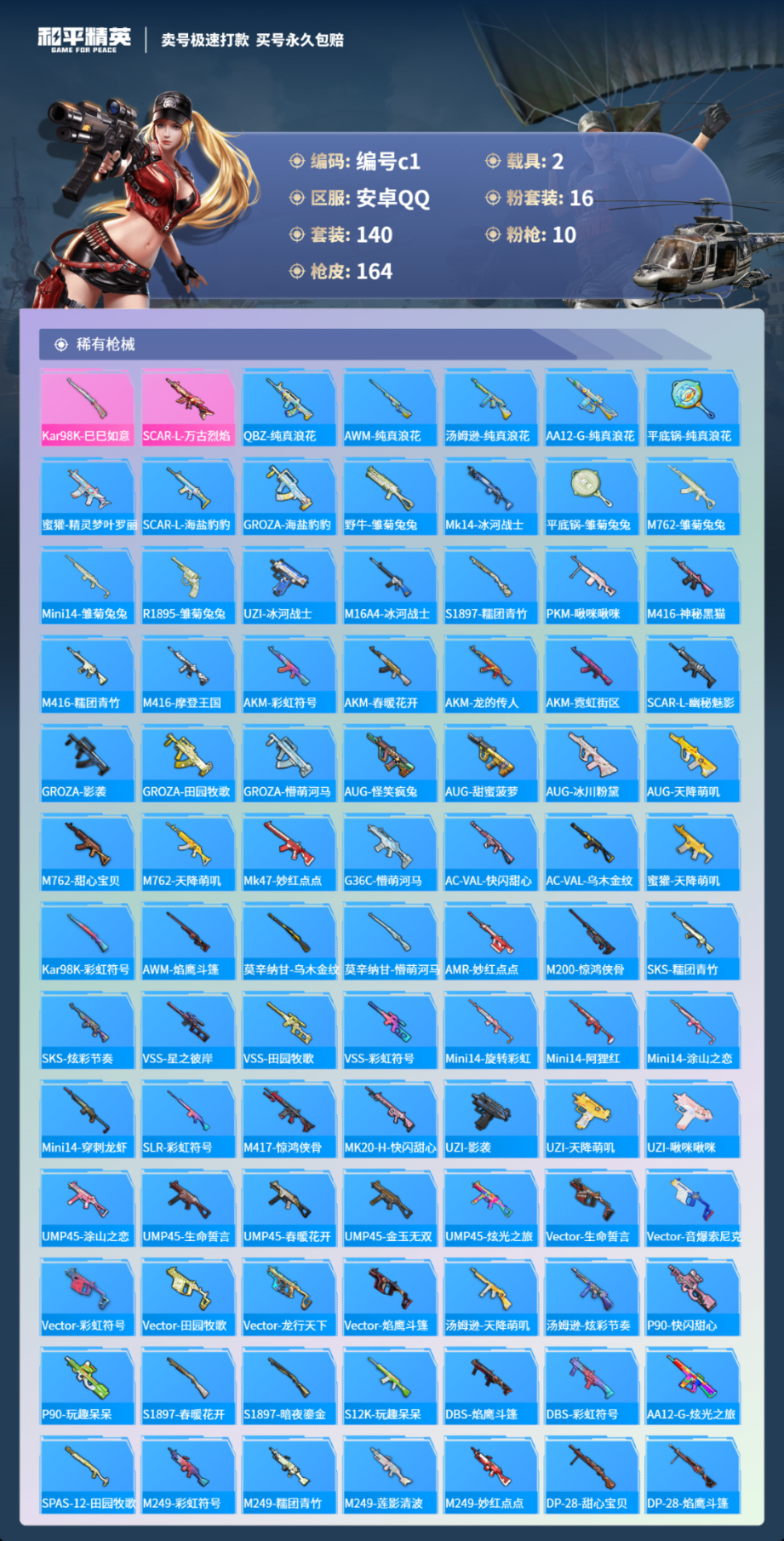 2载具140套装-164枪皮-安卓手Q-11王牌印记-有战神框-16粉装-10特效枪-2载具-80647热力值-140套装-164枪皮-8卓越印记-8传奇印记