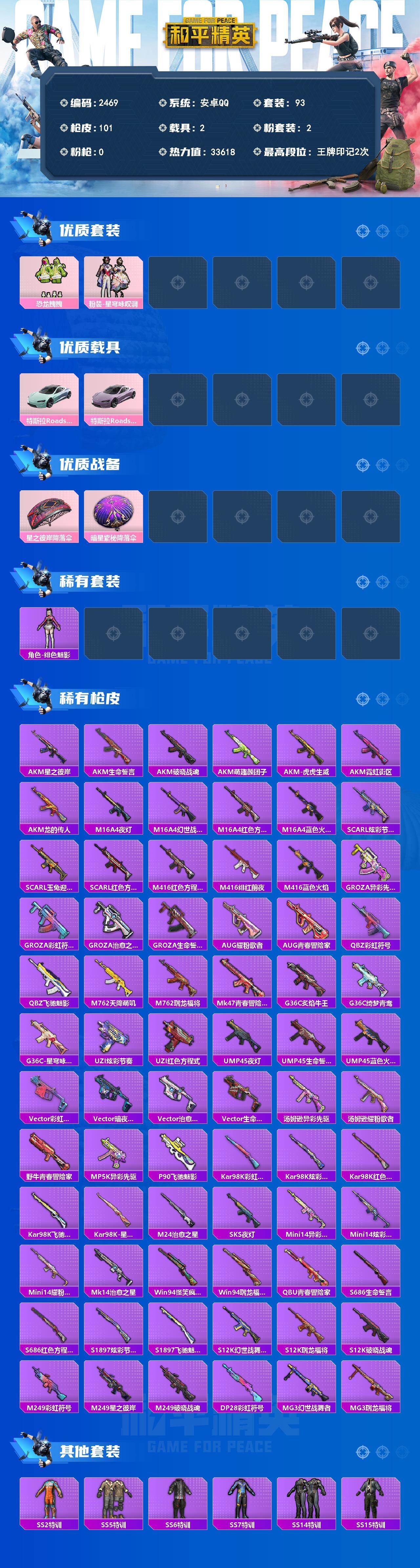 【2469】df安卓【水滴蓝特斯拉,2载具,老6服,】 手Q-2粉装-0特效枪-2载具-0粉色飞行器-33618热力值-2王牌印记-93套装-101枪皮