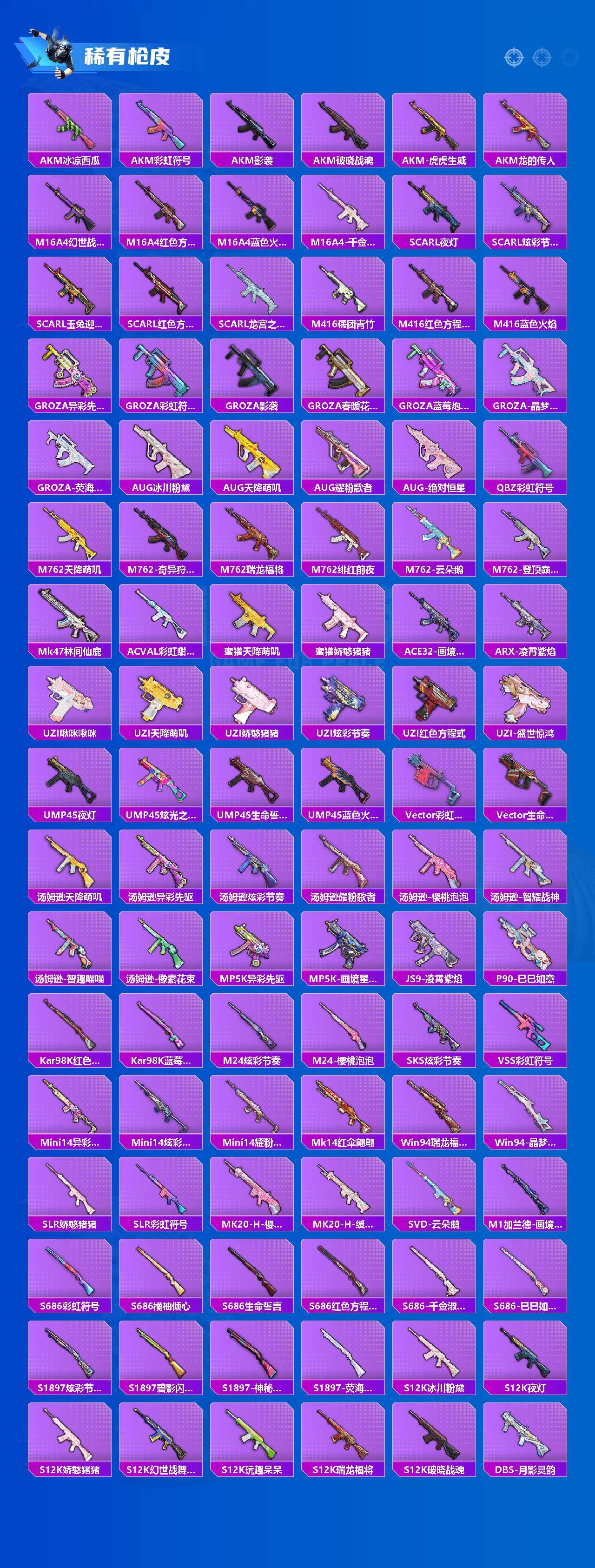 【粉色枪皮等级】:ACE32-萌骑漫游(二级),Kar98K-巳巳如意(五级),Mk14-樱桃泡泡(五级),Mk14-福马献瑞(五级),AMR-智耀战神