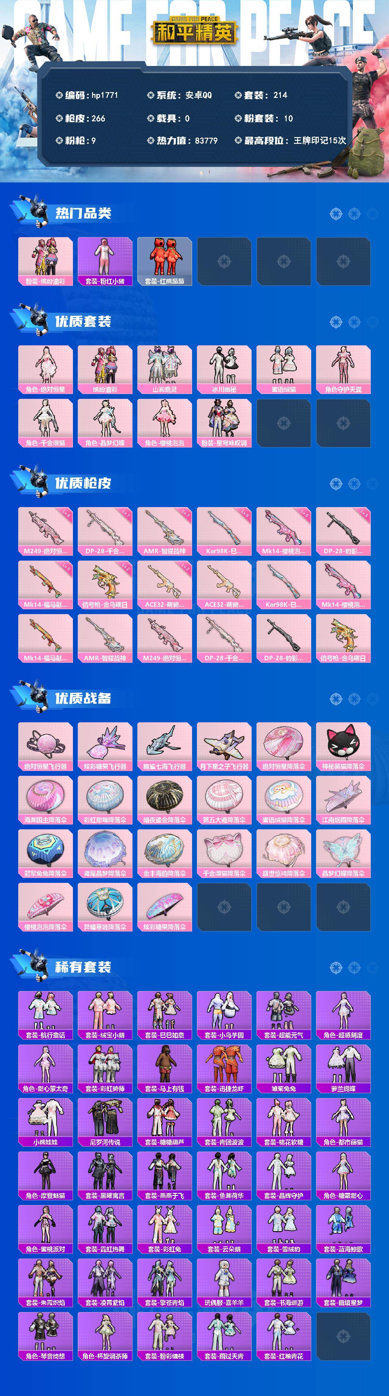 安卓 手Q-10粉装-9特效枪-0载具-5粉色飞行器-83779热力值-15王牌印记-214套装-266枪皮