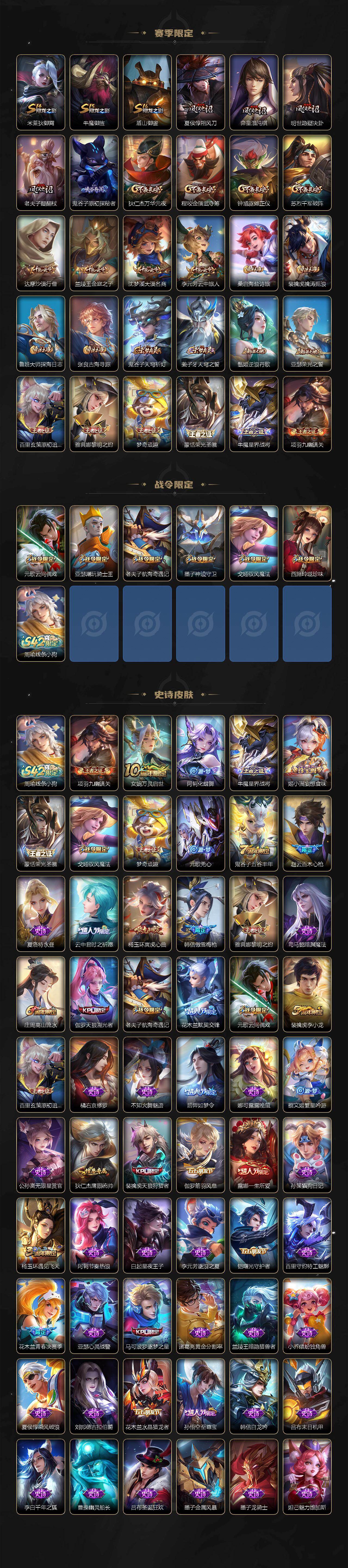 【限定皮肤】:姜子牙天穹之誓,狄仁杰阴阳师,赵云皇家上将,赵云百木心枪,墨子神迹守卫,嬴政优雅恋人,庄周高