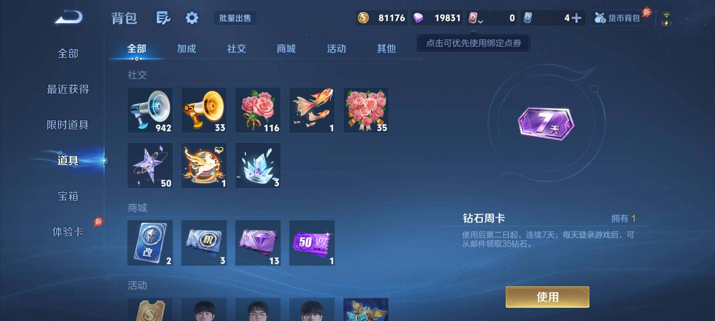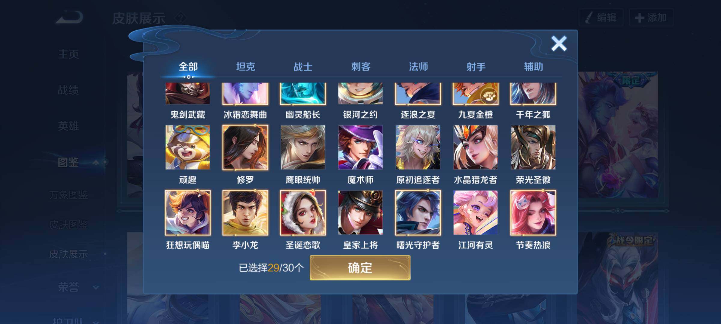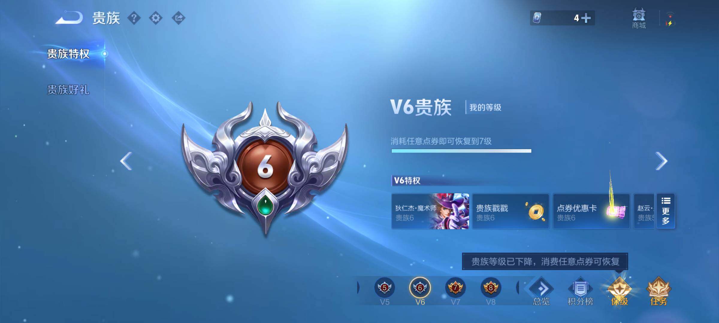 【16777286】贵族等级6/荣耀典藏数量1/传说皮肤数量2/史诗皮肤数量4