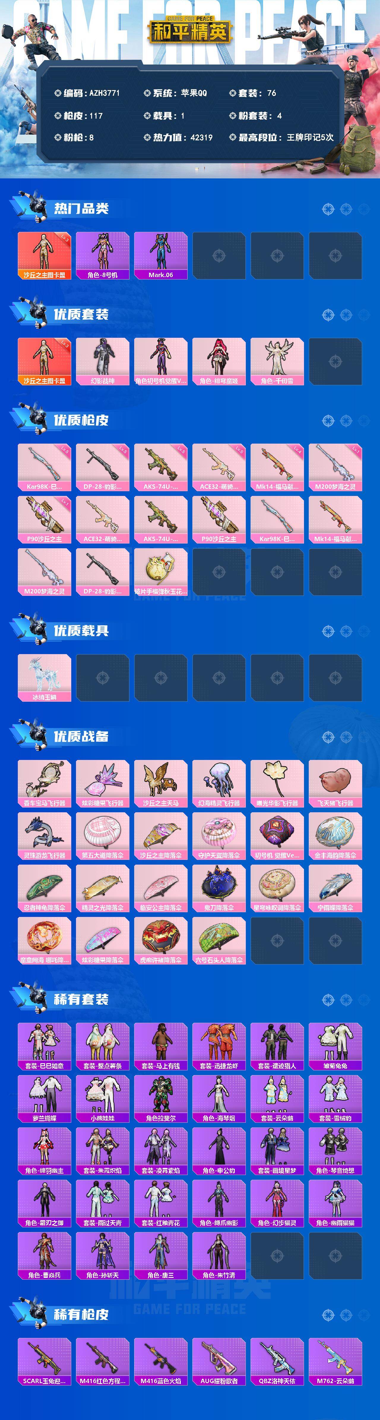 【AZH3771】苹果 手Q【三级图卡盟 幻影战神 1载具】1神装-4粉装-8特效枪-1载具-7粉色飞行器-42319热力值-5王牌印记-76套装-117枪皮