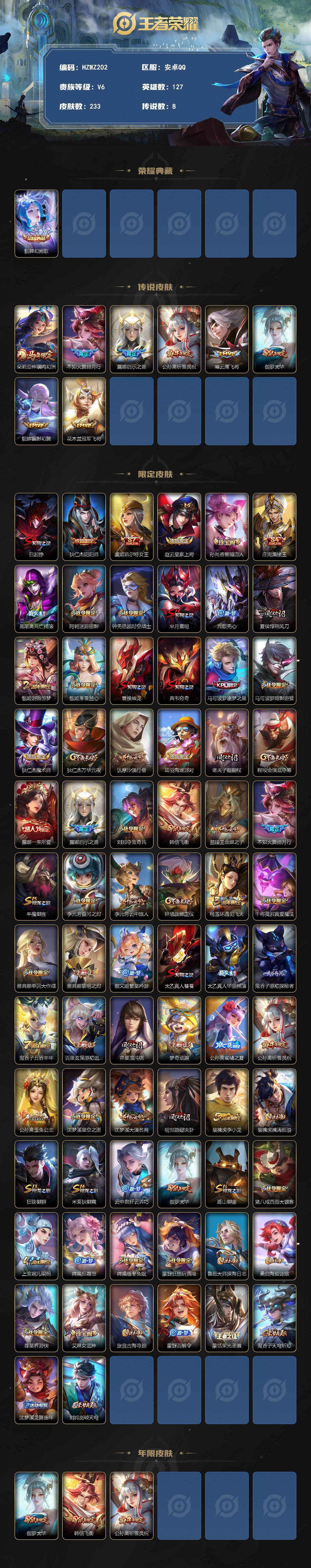 安卓Q-V6-最强王者段位-127英雄-233皮肤-1典藏皮肤-8传说-73史诗