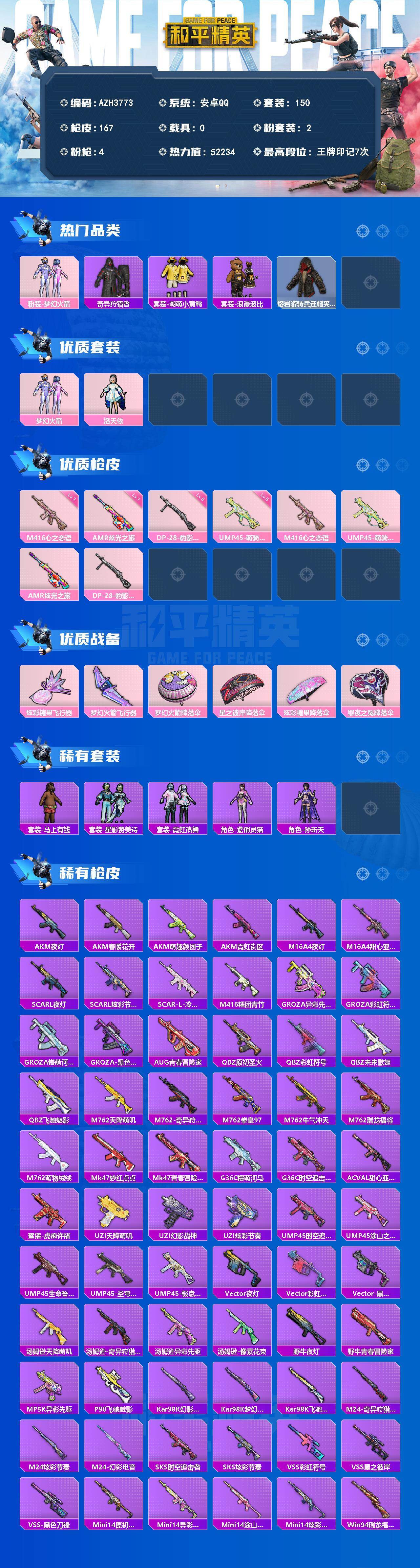 【AZH3773】安卓 手Q【梦幻火箭洛天依奇迹天团 满级心之恋语M416 炫光之旅AMR】2粉装-4特效枪-0载具-2粉色飞行器-52234热力值-7王牌印记-150套装-167枪皮