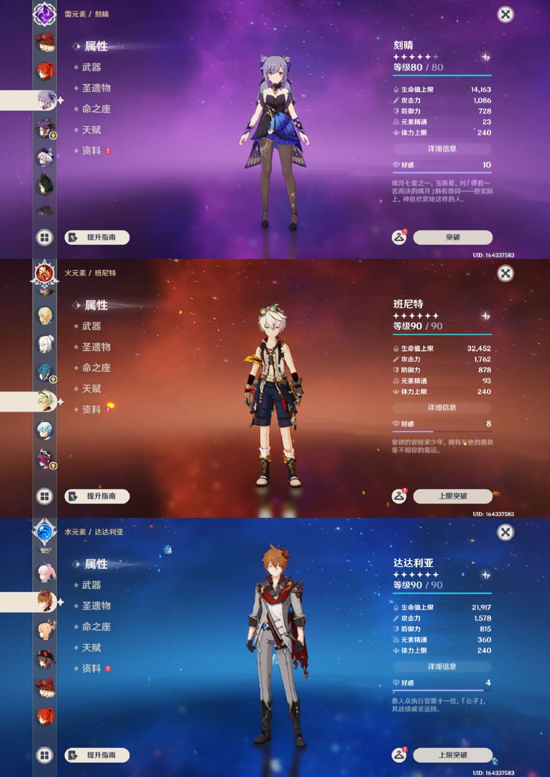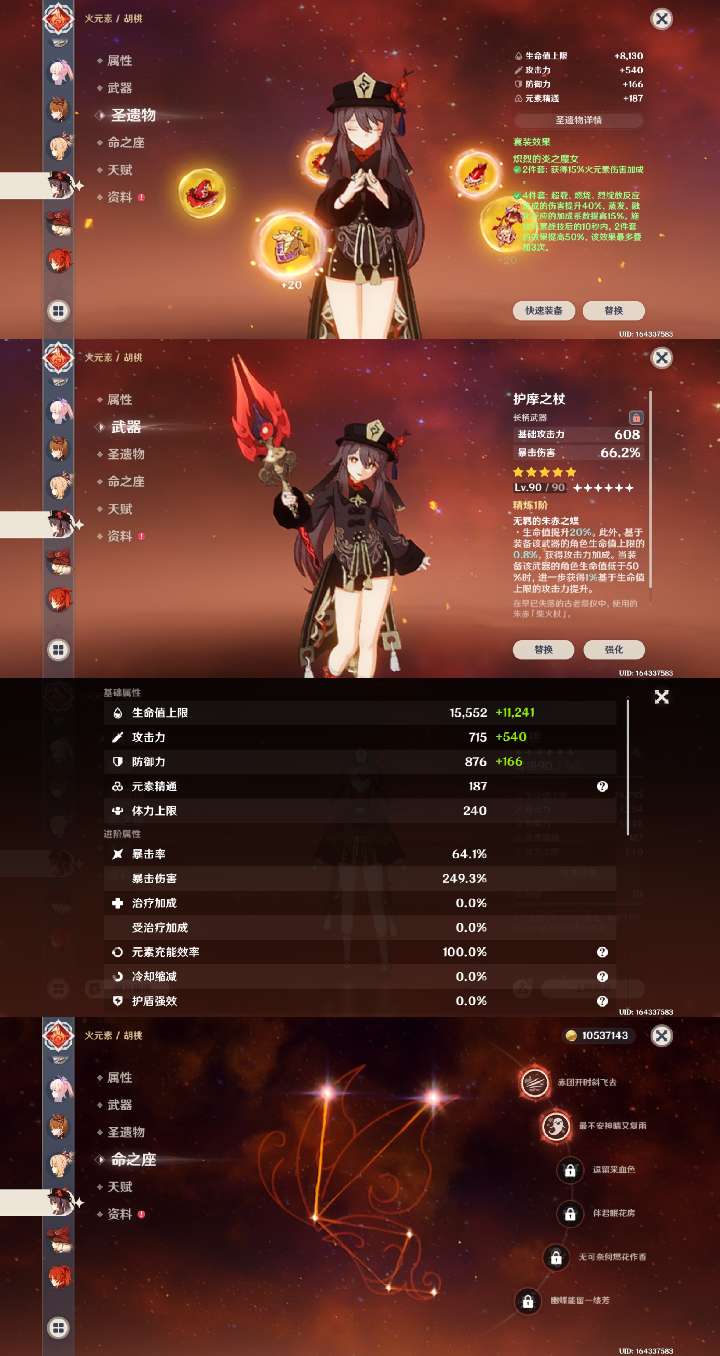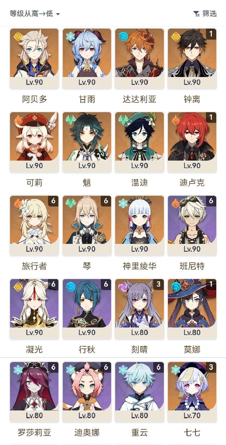 胡桃2命带专武,雷神甘雨魈草神娜维娅神里绫华万叶宵宫可莉都带有专武,钟离1命,专武很多,角色练度很高