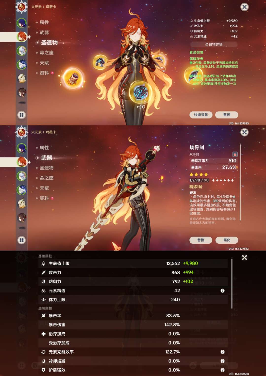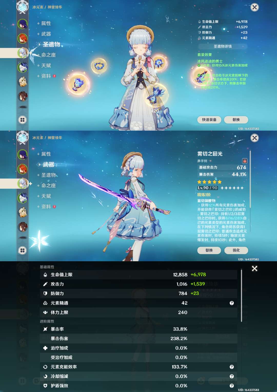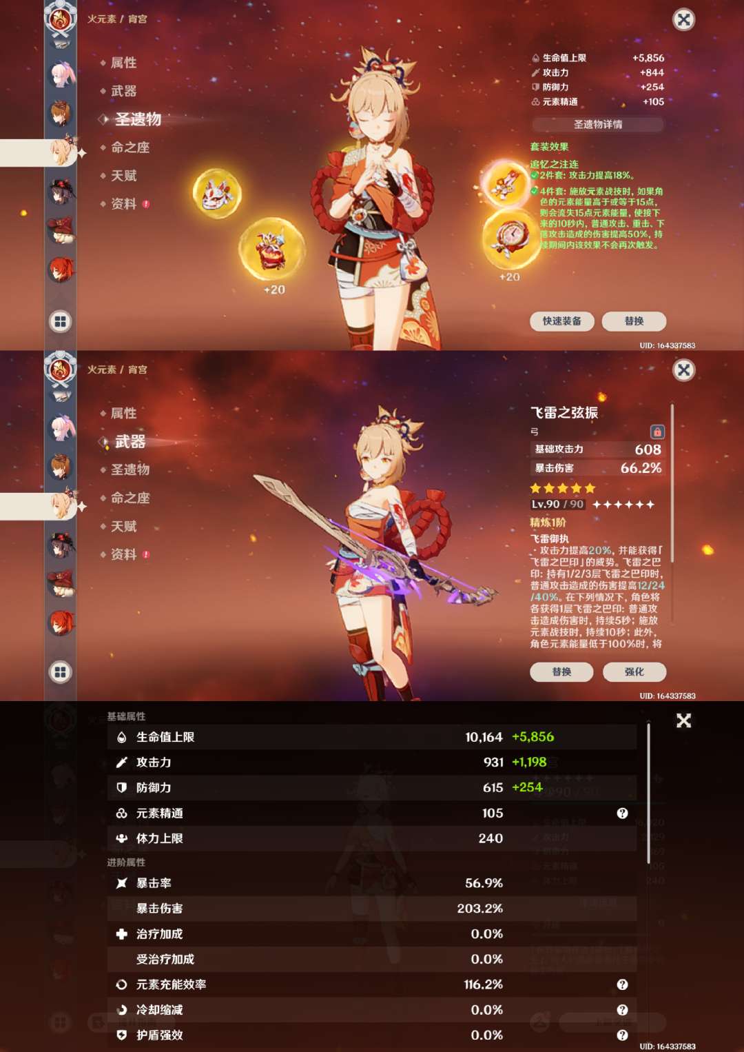 胡桃2命带专武,雷神甘雨魈草神娜维娅神里绫华万叶宵宫可莉都带有专武,钟离1命,专武很多,角色练度很高