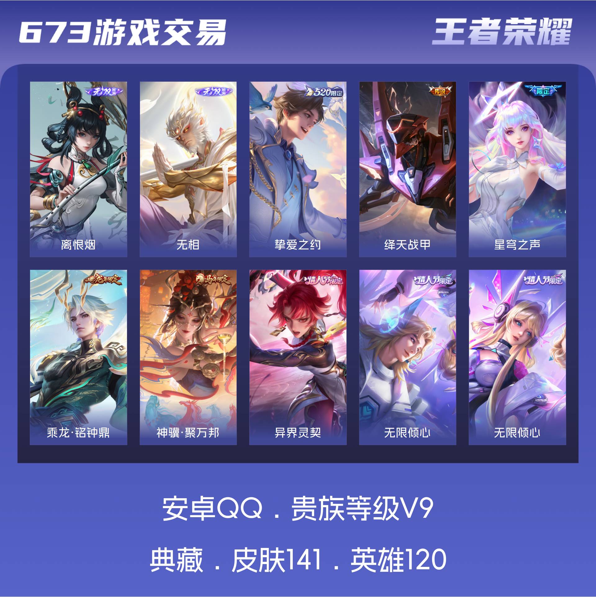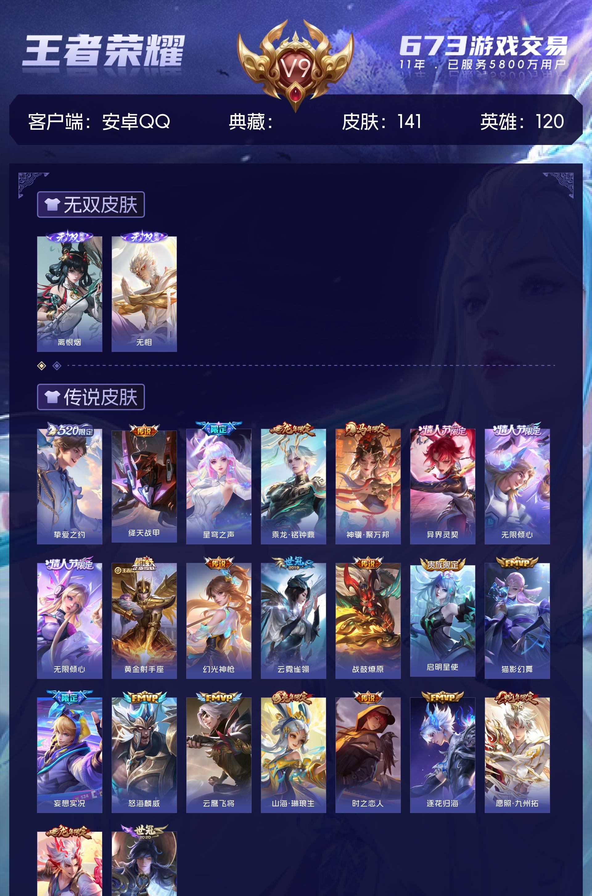 V9 皮肤141 英雄120 至尊星耀 无双皮肤2 星传说1 传说23