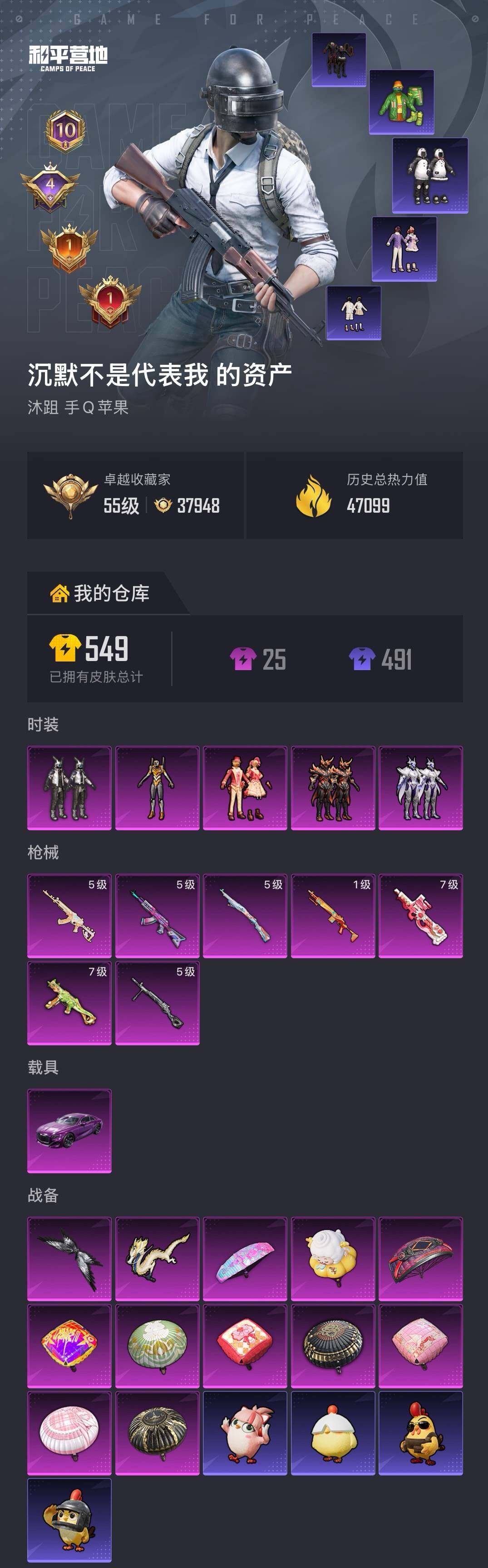 【AZH3769】苹果 手Q【黄螳螂暗影哥特胖达圆圆 满级恐龙拽拽UMP45 甜蜜草莓P90 1载具】5粉装-7特效枪-1载具-2粉色飞行器-47099热力值-10王牌印记-126套装-148枪皮