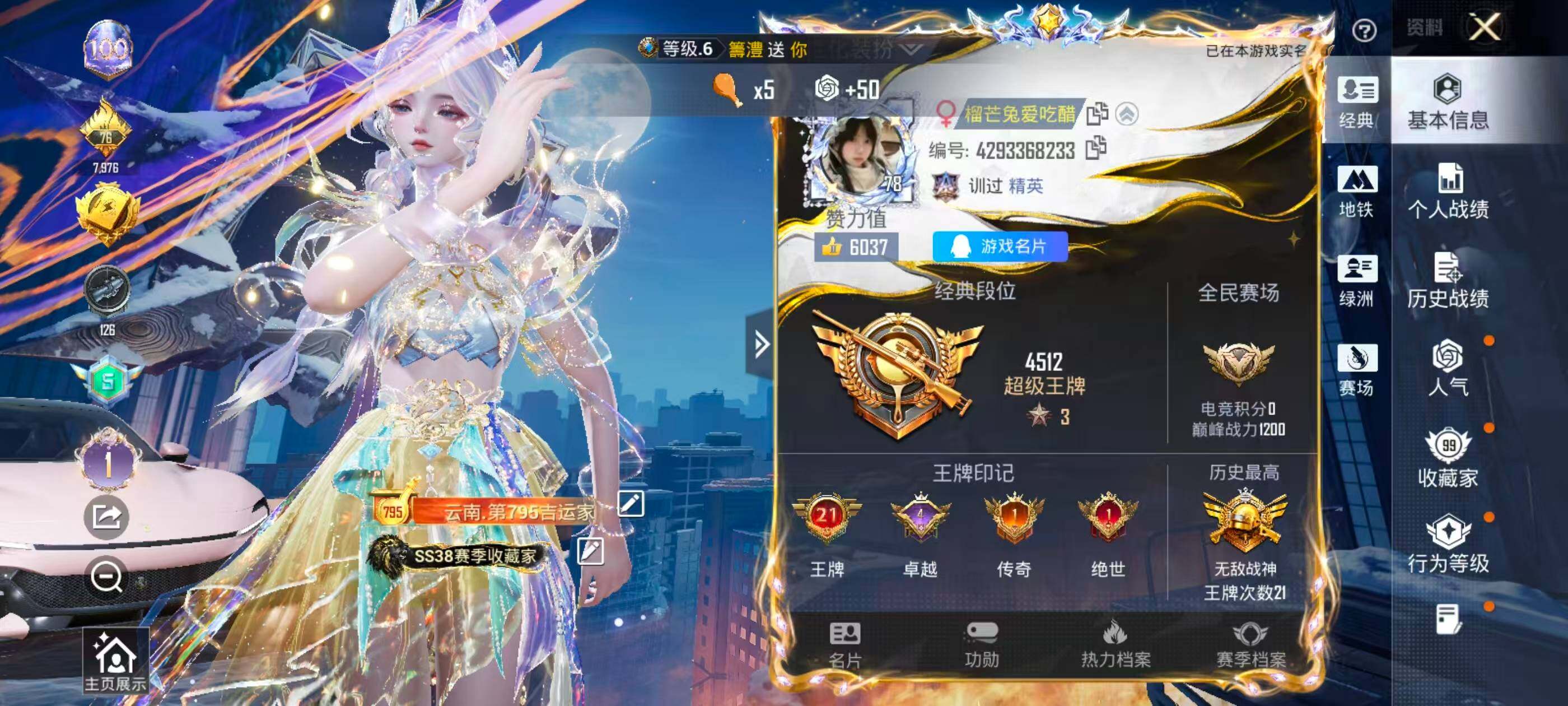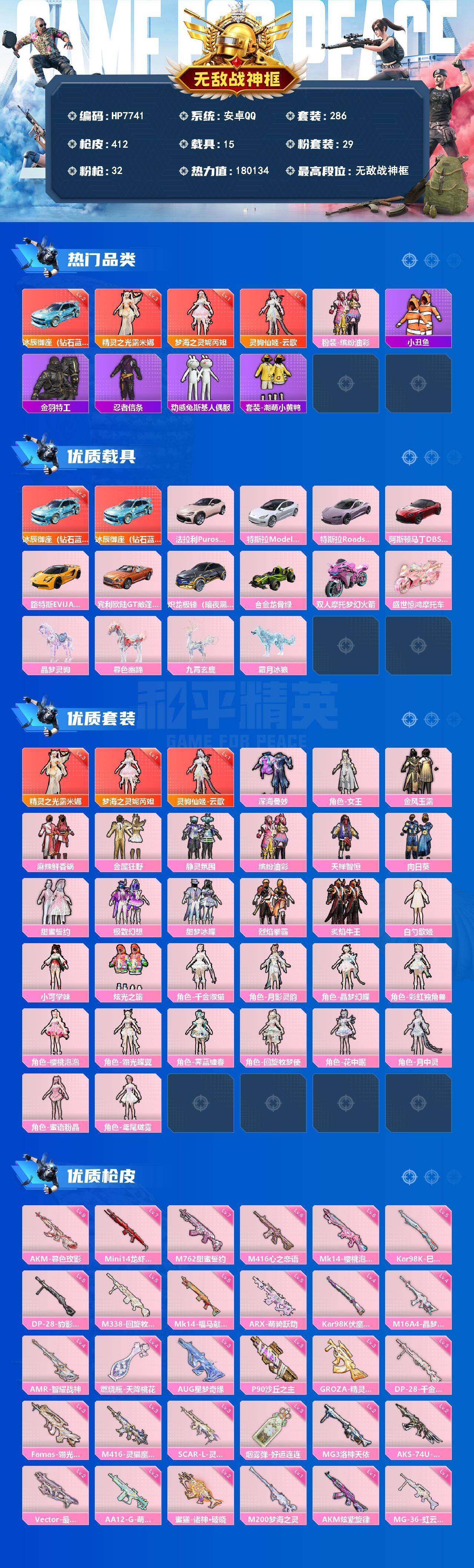 无敌战神号(3红套29粉套32粉枪15载具)地铁满天赋/云歌1级/露米娜3级/妮芮妲1级/AKM-暮色玫影9级/AUG-星梦奇缘3级/深海曼妙/女王/金风玉露/麻辣鲜香锅/金属狂野/静灵氛围/极致幻想/甜梦冰蝶/烈焰拳霸/炙焰牛王/白勺歌姬/冰辰御座钻石蓝/法拉利珊瑚粉/特斯拉珍珠白/特斯拉沁心粉/阿斯顿马丁红/路特斯星际黄/九霄玄鹿/霜月冰狼/没战神框/HP7741-23粉色飞行器-180134热力值-21王牌印记-286套装-412枪皮