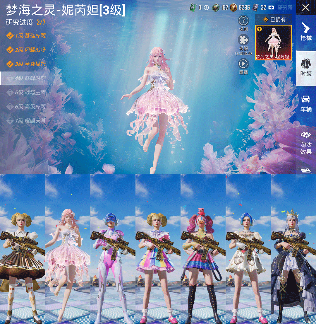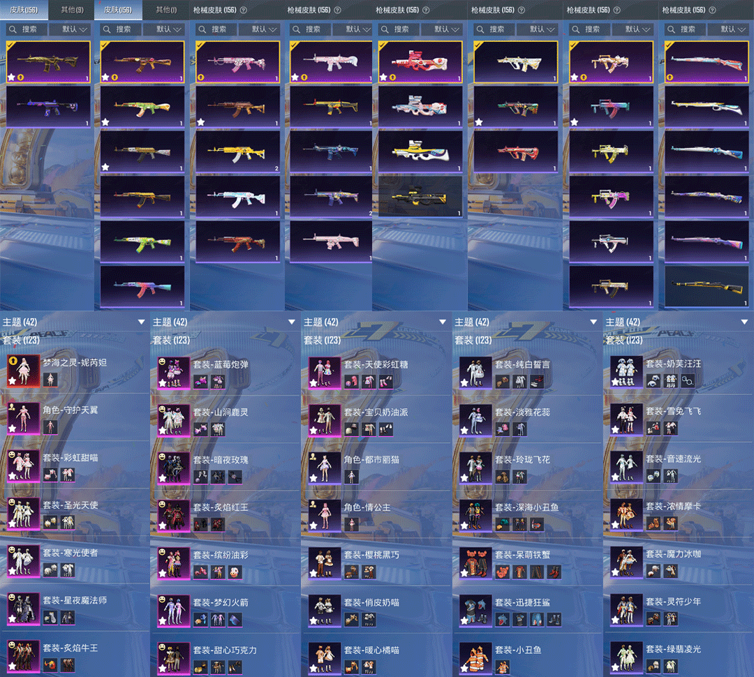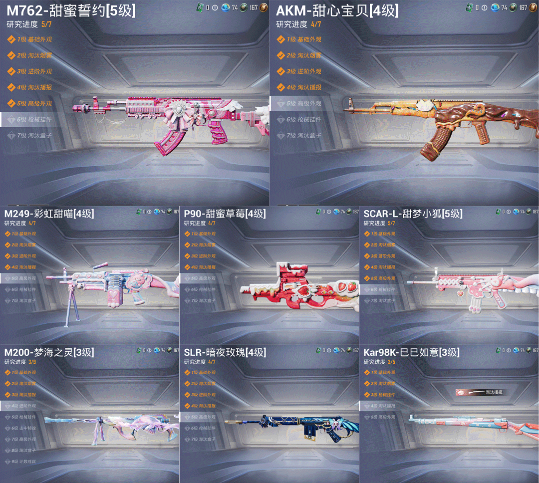 特效枪10:M416-五爪金龙/7级,,SLR-暗夜玫瑰/4级,,GROZA-焦糖拿铁/7级,,,SCAR-L-甜梦小狐/5级,AKM-甜心宝贝/4级,,M249-彩虹甜喵/4级,,M762-甜蜜誓约/5级,,P90-甜蜜草莓/4级,,M200-梦海之灵/3级,,Kar98K-巳巳如意/3级,