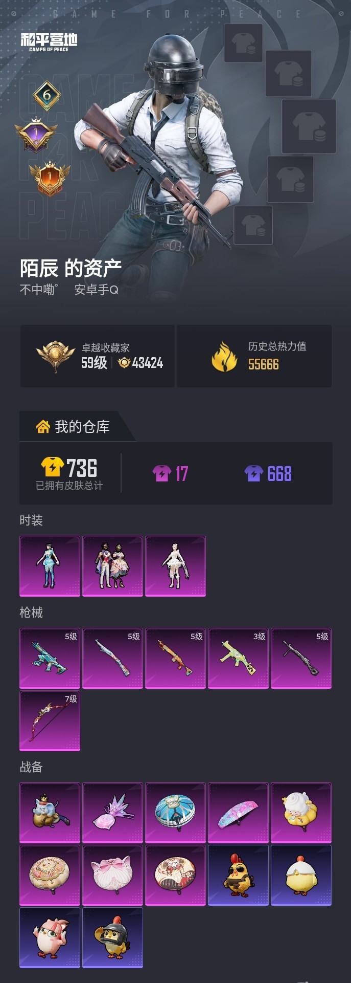 可二次【M4黄金龙骨小丑鱼迅捷狂鲨深海小丑鱼6特效枪3粉装 秒换绑不用等】 安卓Q区-55666热力值-152套装-200枪皮 【2稀有】 M416-黄金龙骨 AWM-黄金龙骨【3粉装】 角色-异瞳寒姬 星穹咏叹调 角色-千金淑猫【6特效枪】 Mk14-福马献瑞(5级) UMP45-萌骑冒险(3级) 蜜獾-异瞳寒姬(5级) 爆炸猎弓-拳皇·狂花道(7级) Kar98K-巳巳如意(5级) DP-28-豹影疾电(5级)【222热门】 深海小丑鱼 雪山精英(老6服) 小丑鱼 迅捷狂鲨 极速红龙 白色伏