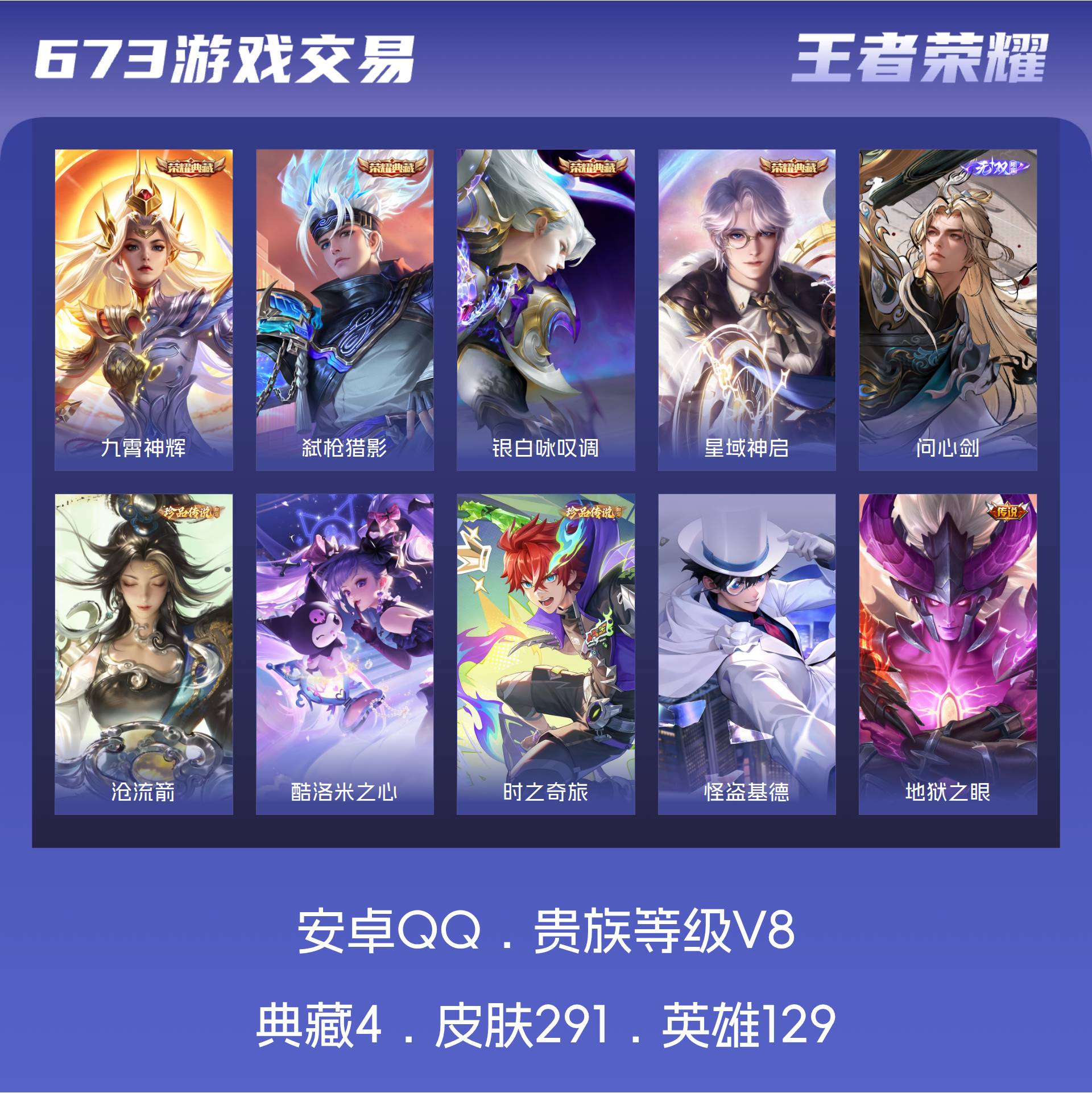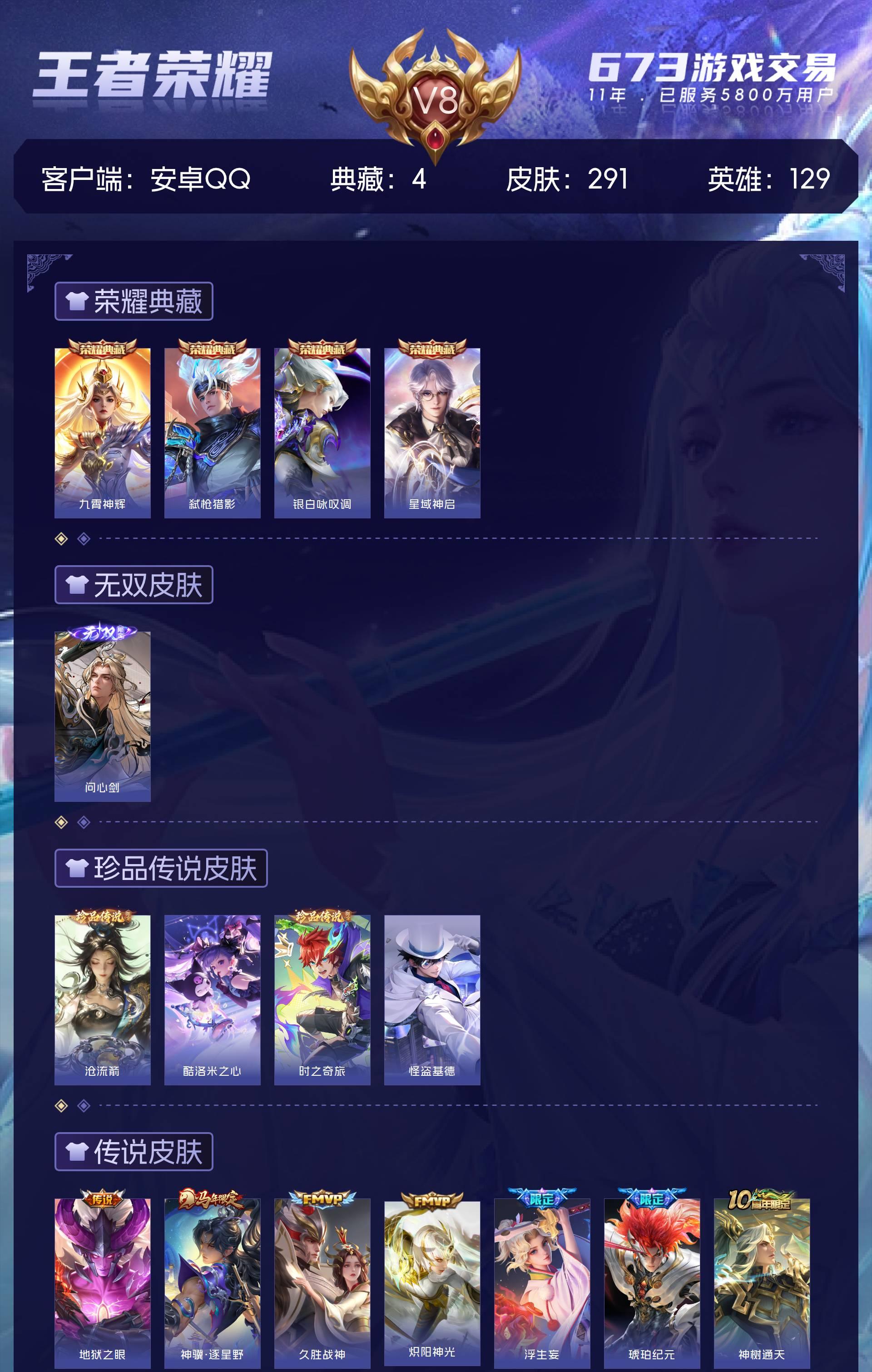 V8 皮肤291 英雄129 永恒钻石 荣耀典藏4 无双皮肤1 珍品传说4 传说21