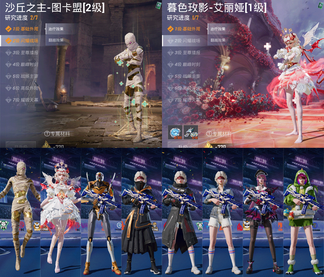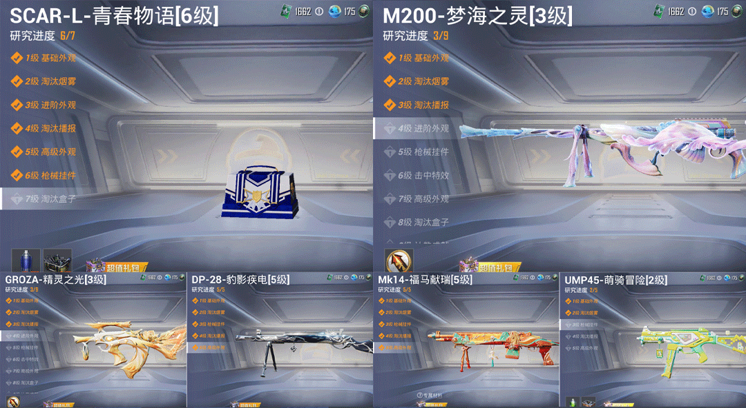 特效枪6:SCAR-L-青春物语/6级,M200-梦海之灵/3级,,GROZA-精灵之光/3级,,UMP45-萌骑冒险/2级,,DP-28-豹影疾电/5级,,Mk14-福马献瑞/5级,,