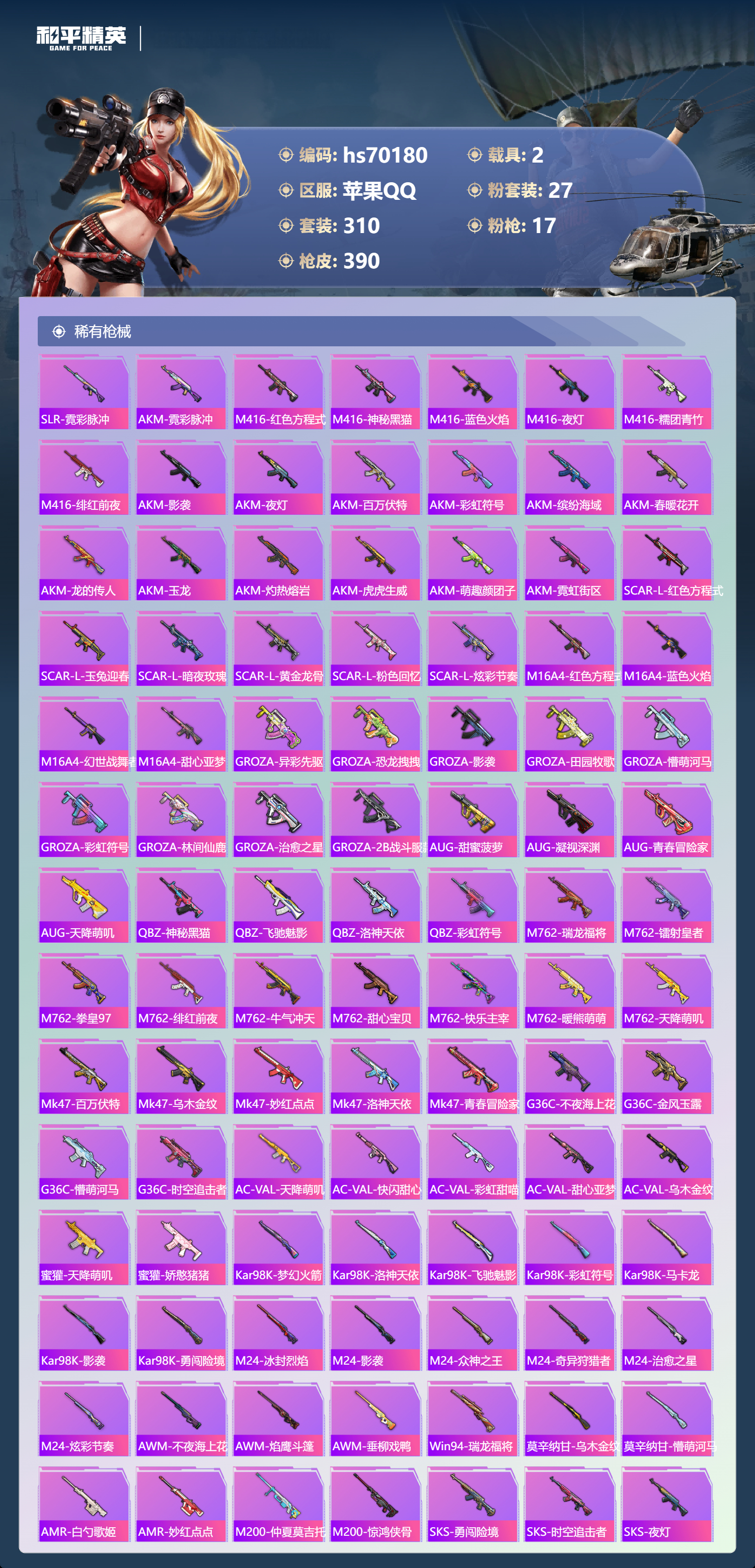 hs70180 苹果手Q-31王牌印记-有战神框-27粉装-17特效枪-2载具-热力值-310套装-390枪皮-9卓越印记-9传奇印记