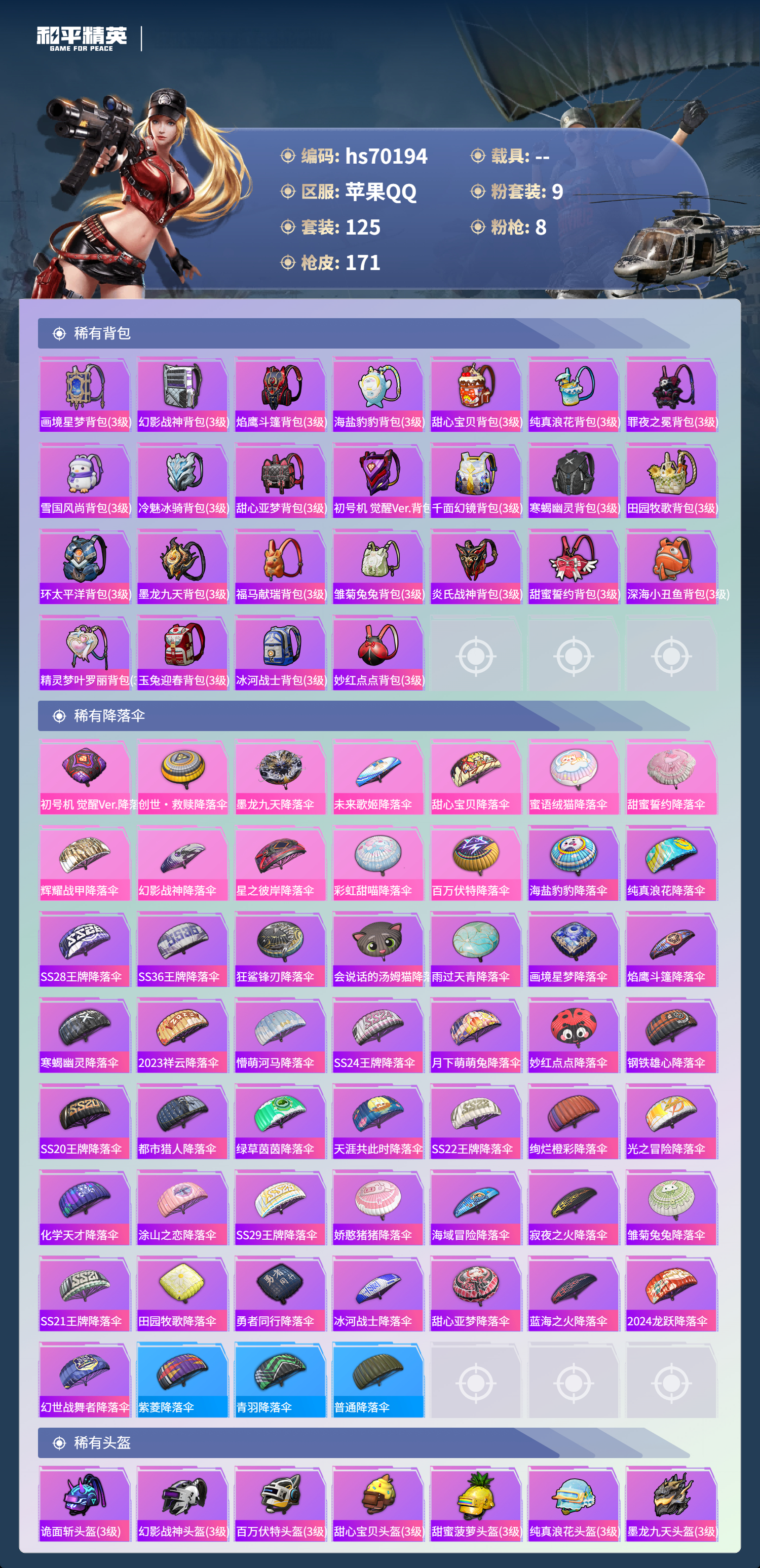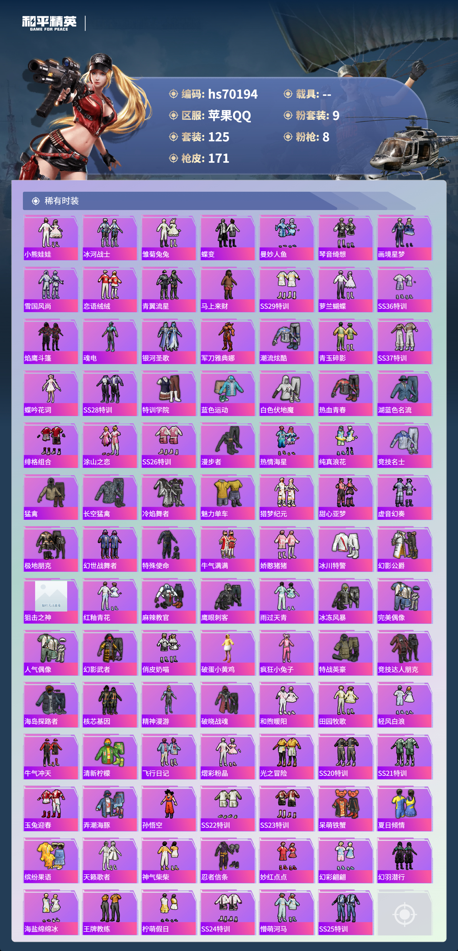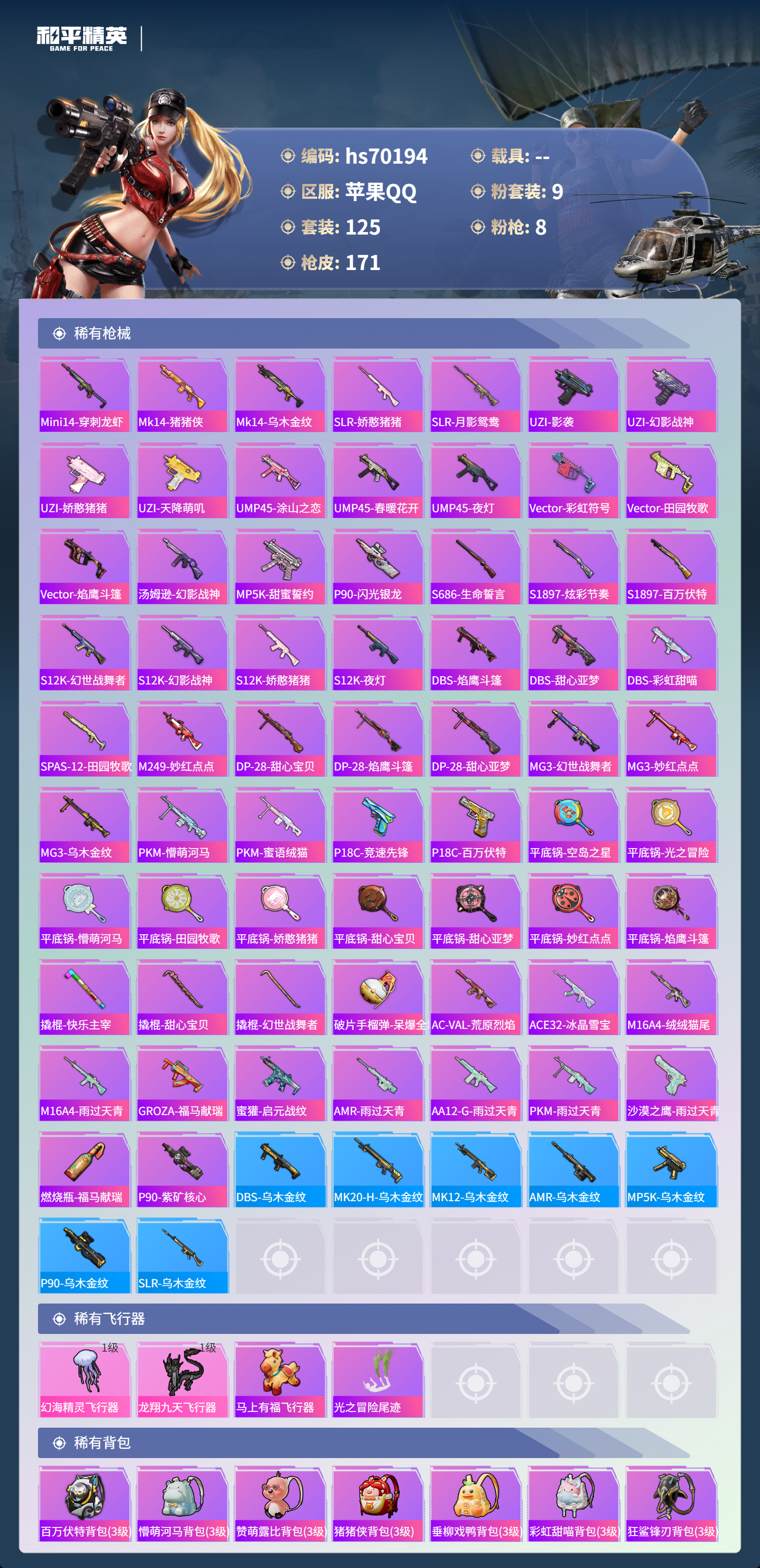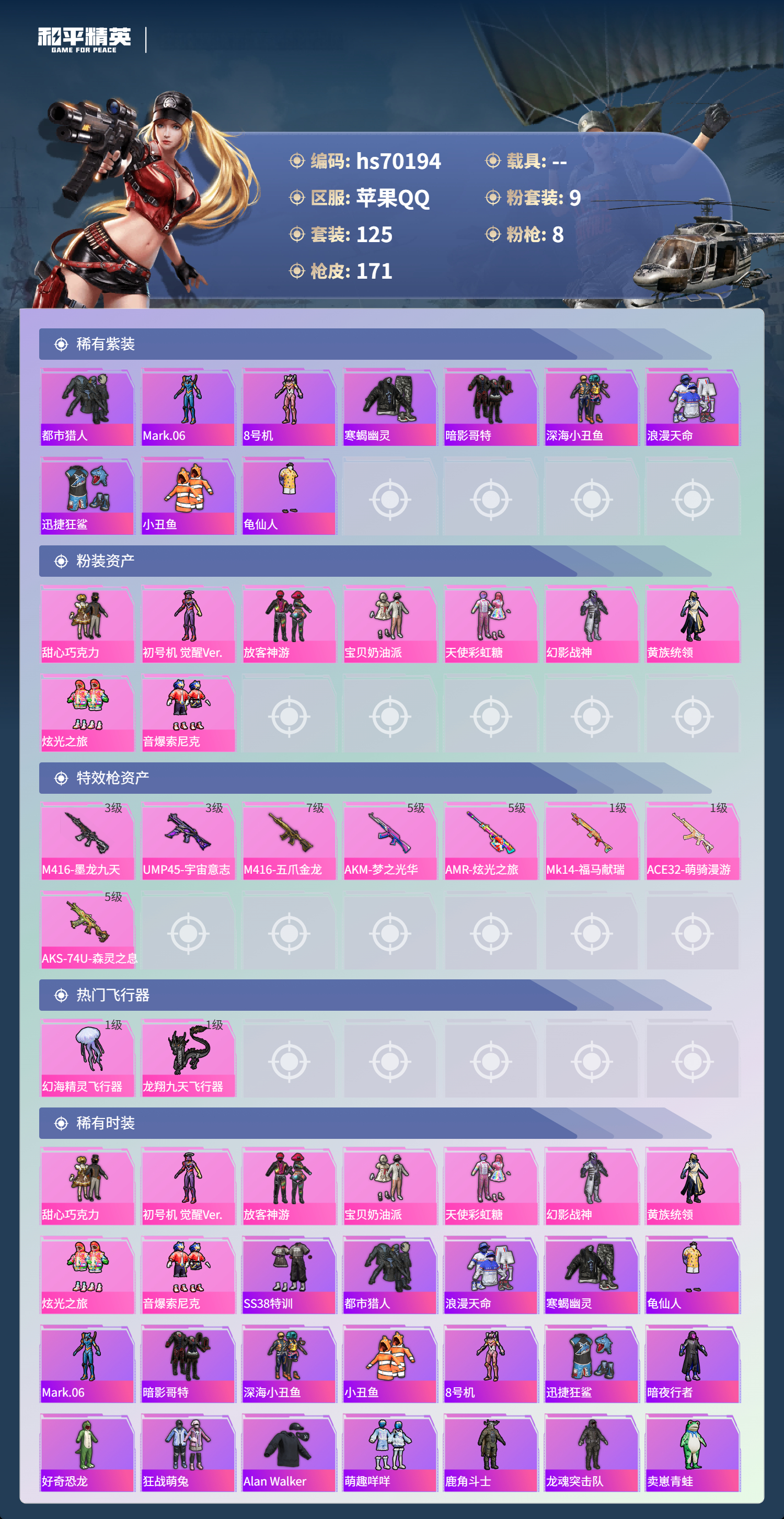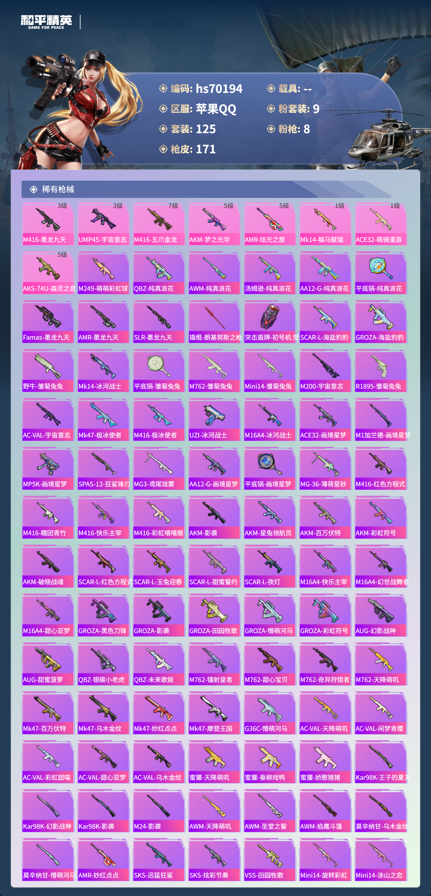 hs70194 苹果手Q-8王牌印记-9粉装-8特效枪-54711热力值-125套装-171枪皮