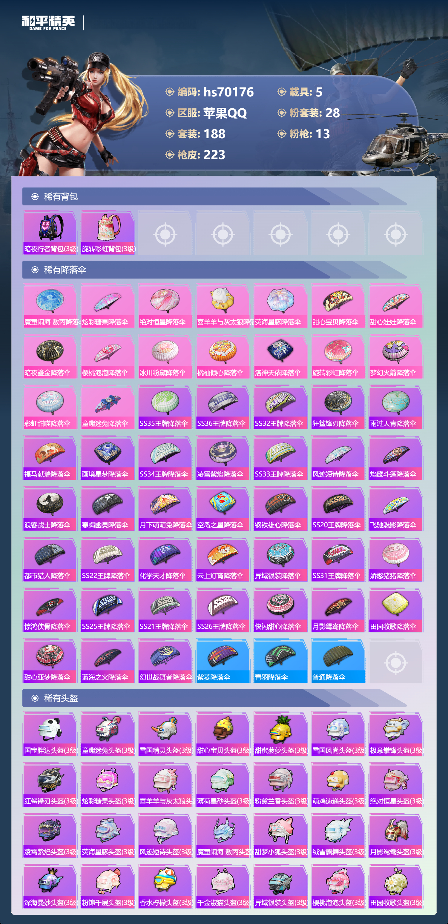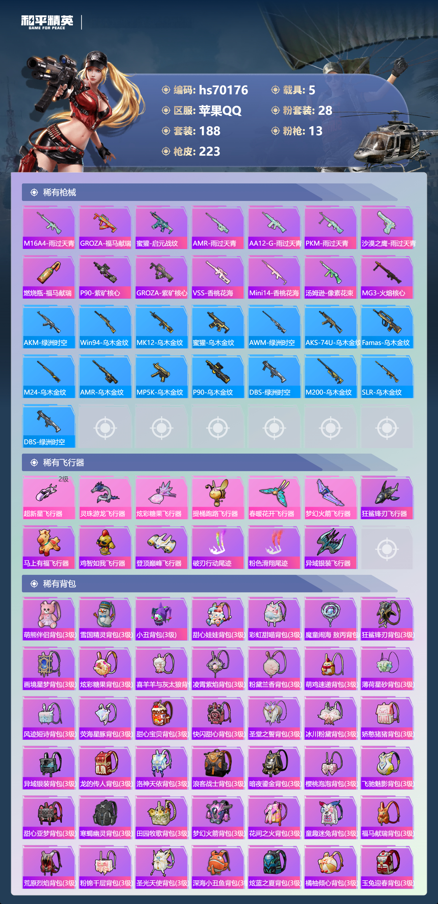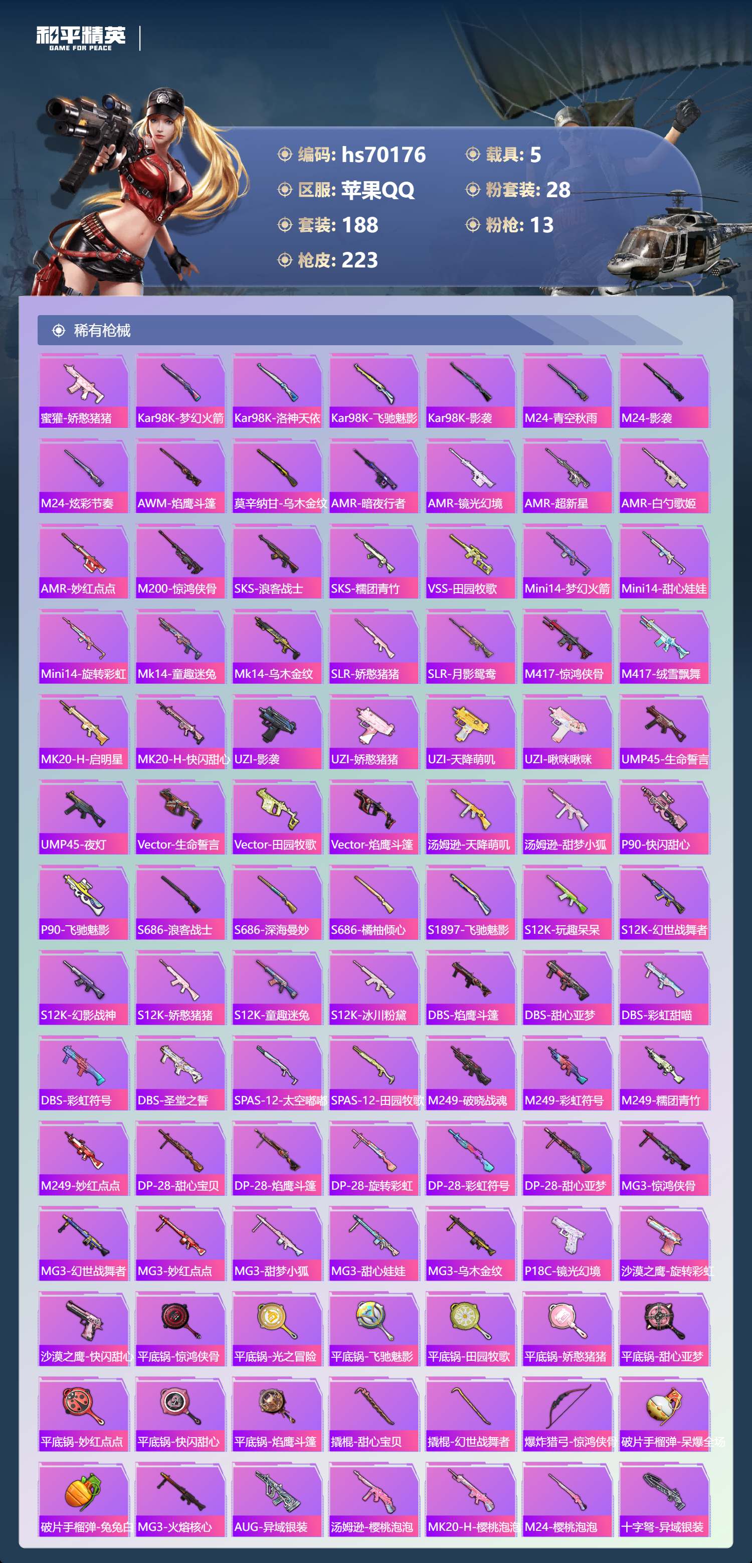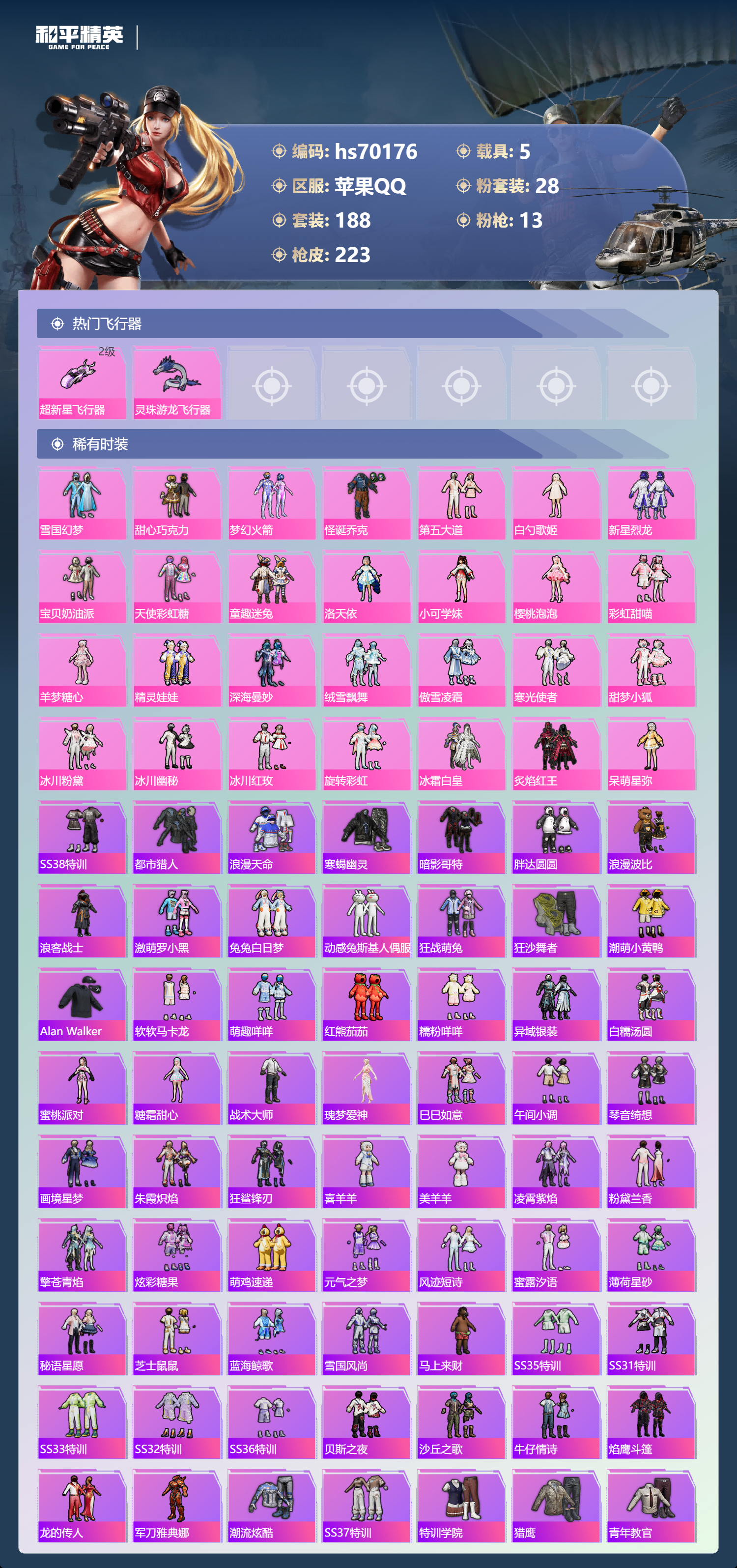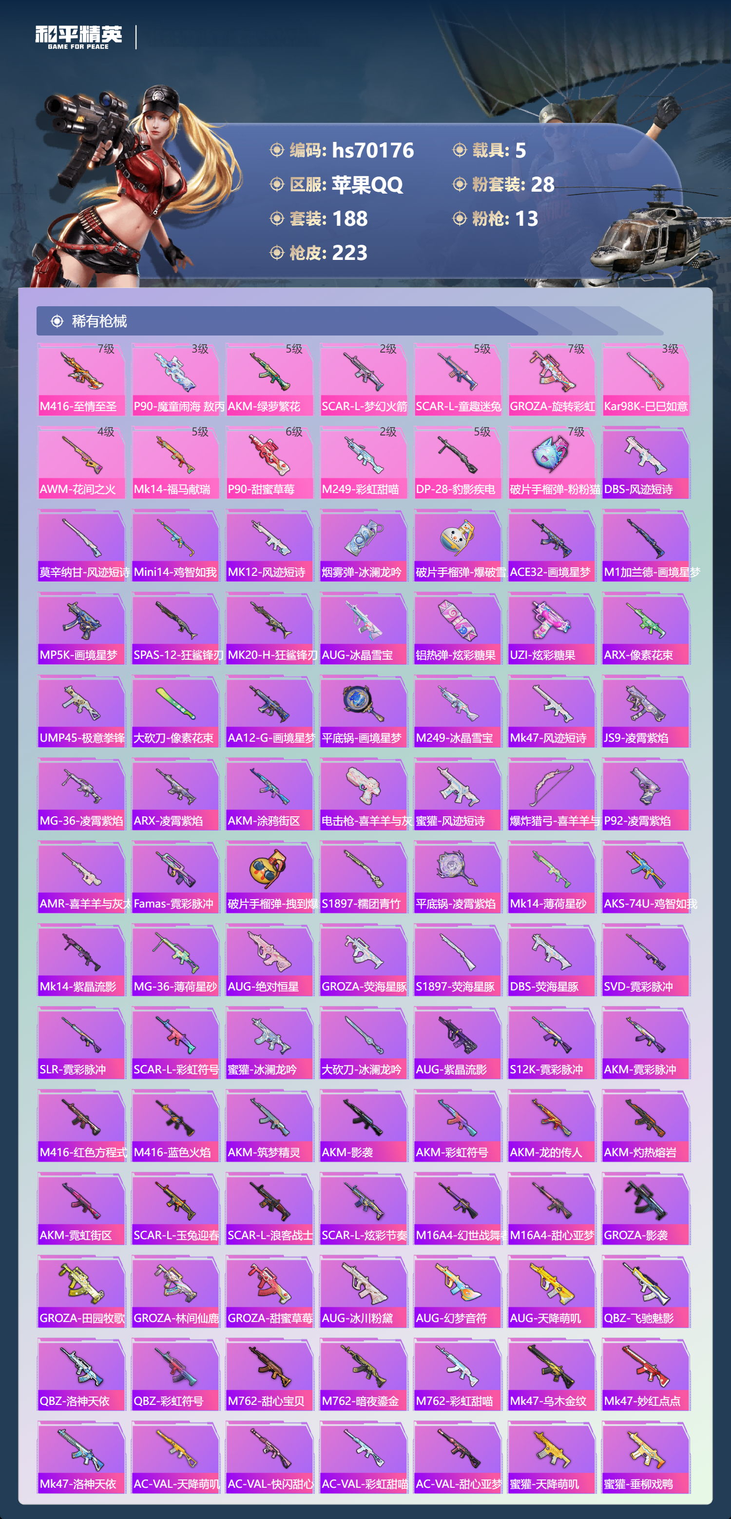 hs70176 苹果手Q-12王牌印记-有战神框-28粉装-13特效枪-5载具-82872热力值-188套装-223枪皮-3卓越印记-2传奇印记