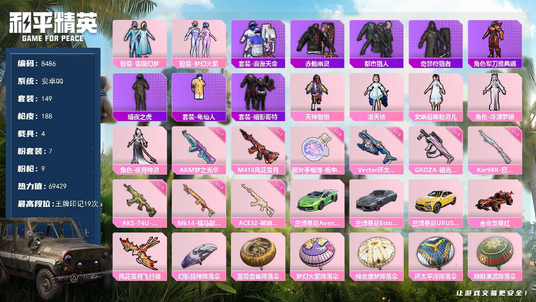 【8486】7粉装-9特效枪-4载具-2粉色飞行器-69429热力值-19王牌印记-149套装-188枪皮