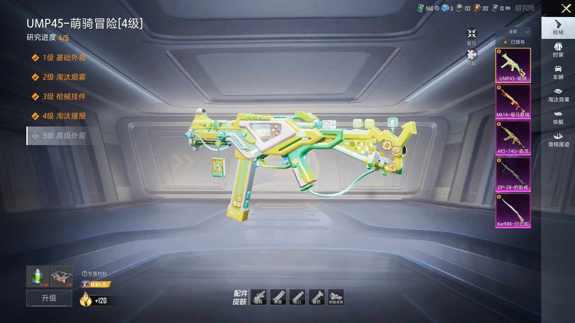 【粉色枪皮等级】:UMP45-萌骑冒险(四级),AKS-74U-森灵之息(五级),Kar98K-巳巳如意(五级),Mk14-福马献瑞(五级)