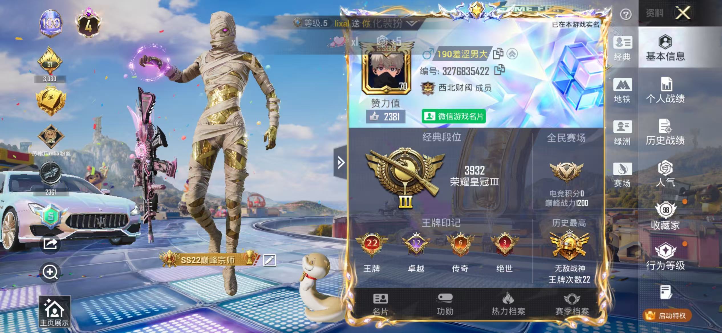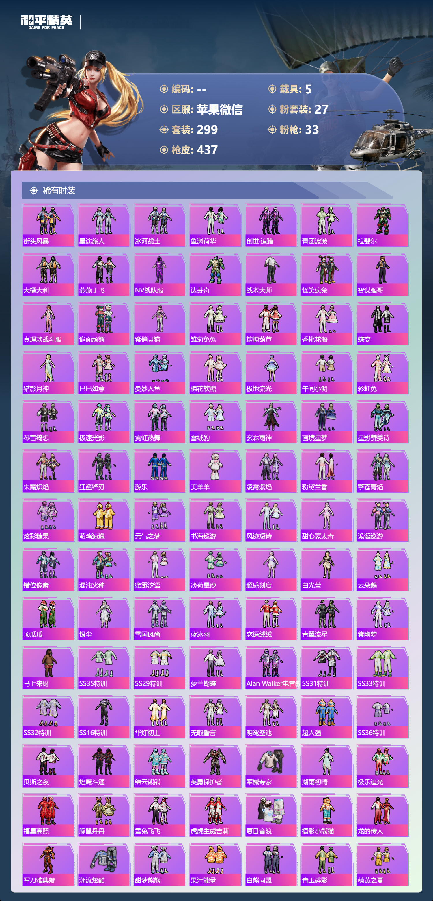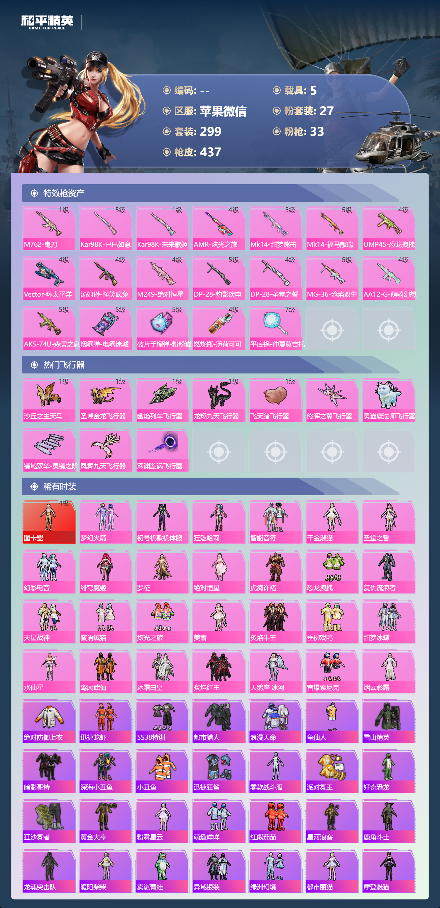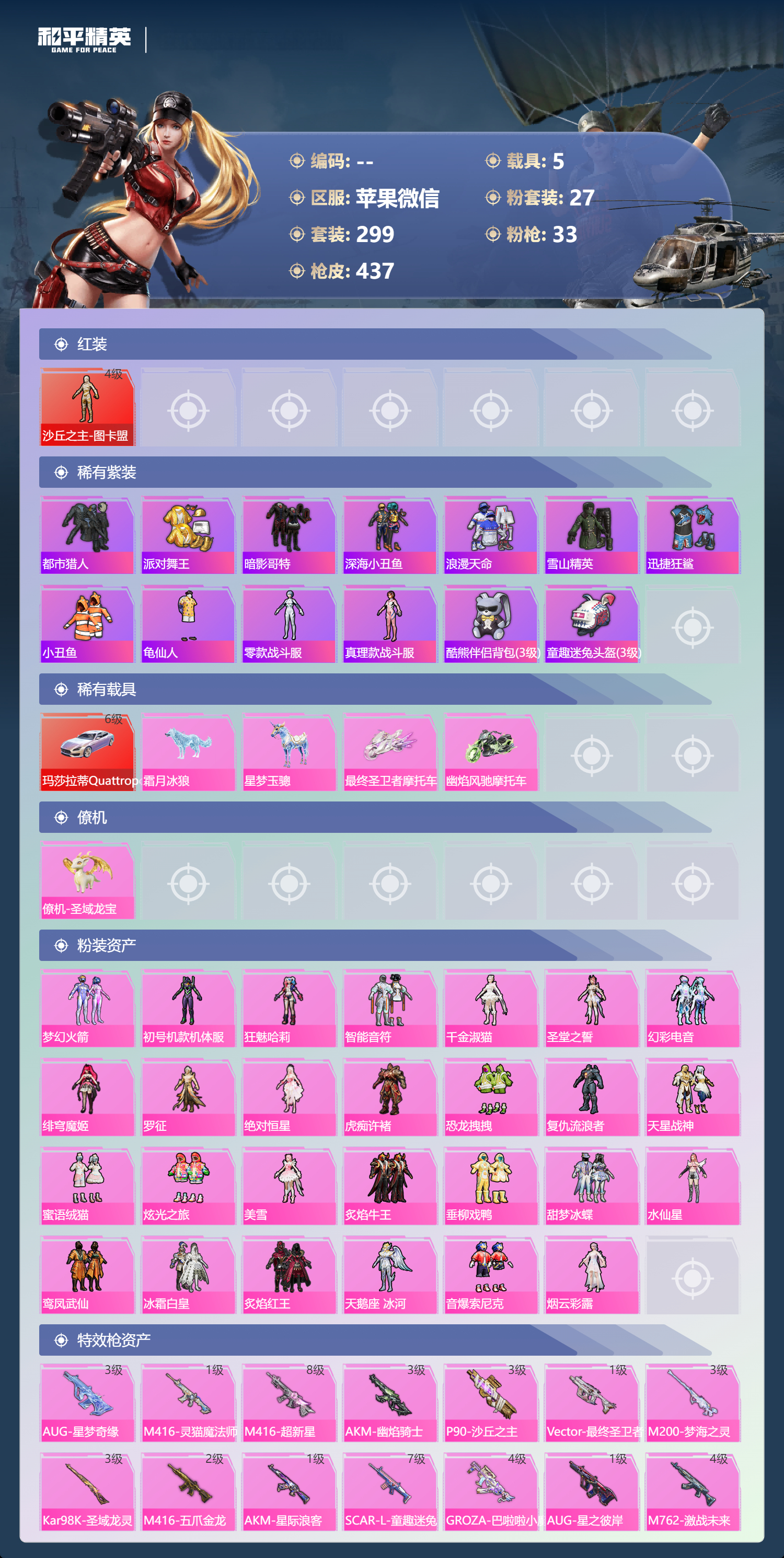 hs70644 苹果微信-22王牌印记-有战神框-1红装-27粉装-33特效枪-5载具-热力值-299套装-437枪皮-12卓越印记-6传奇印记