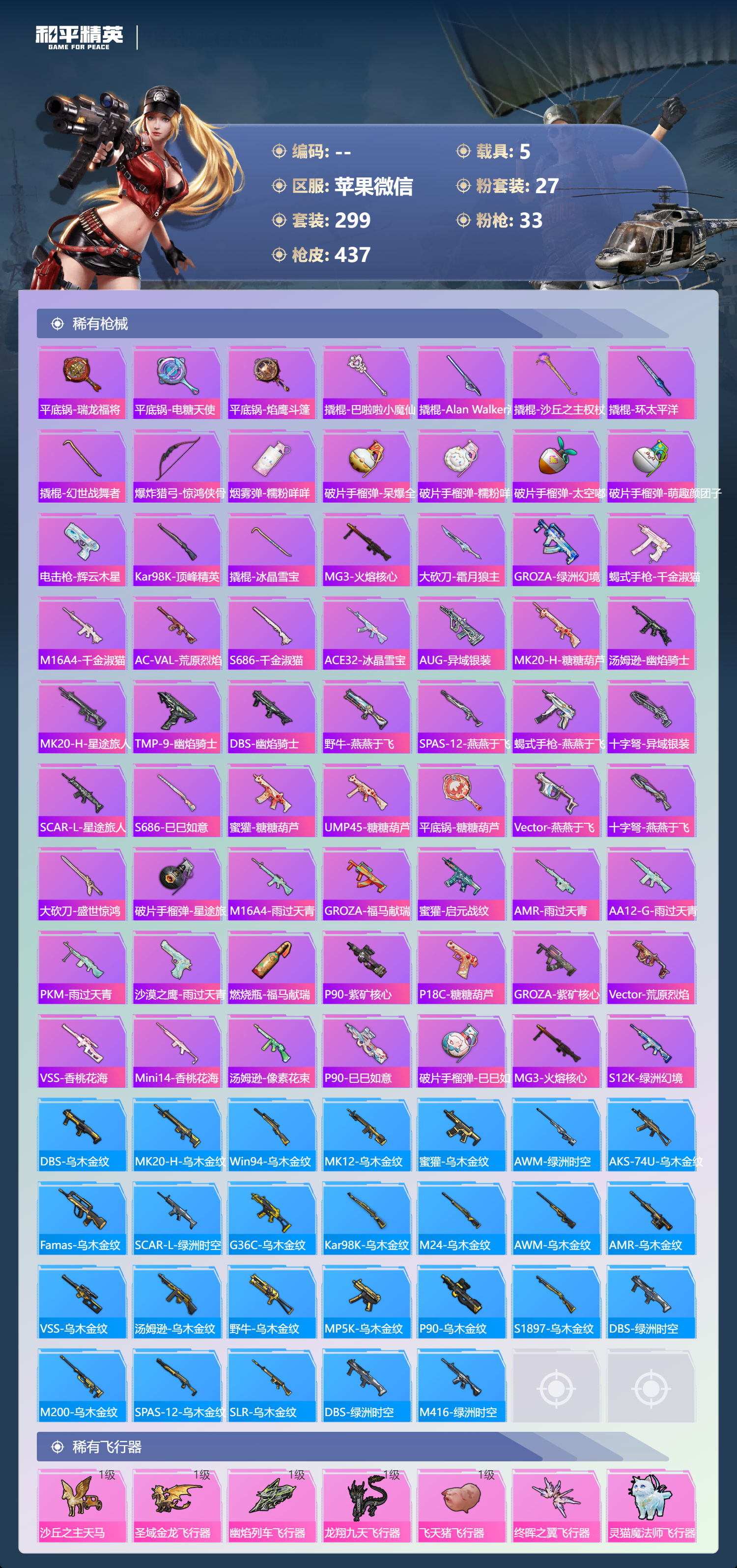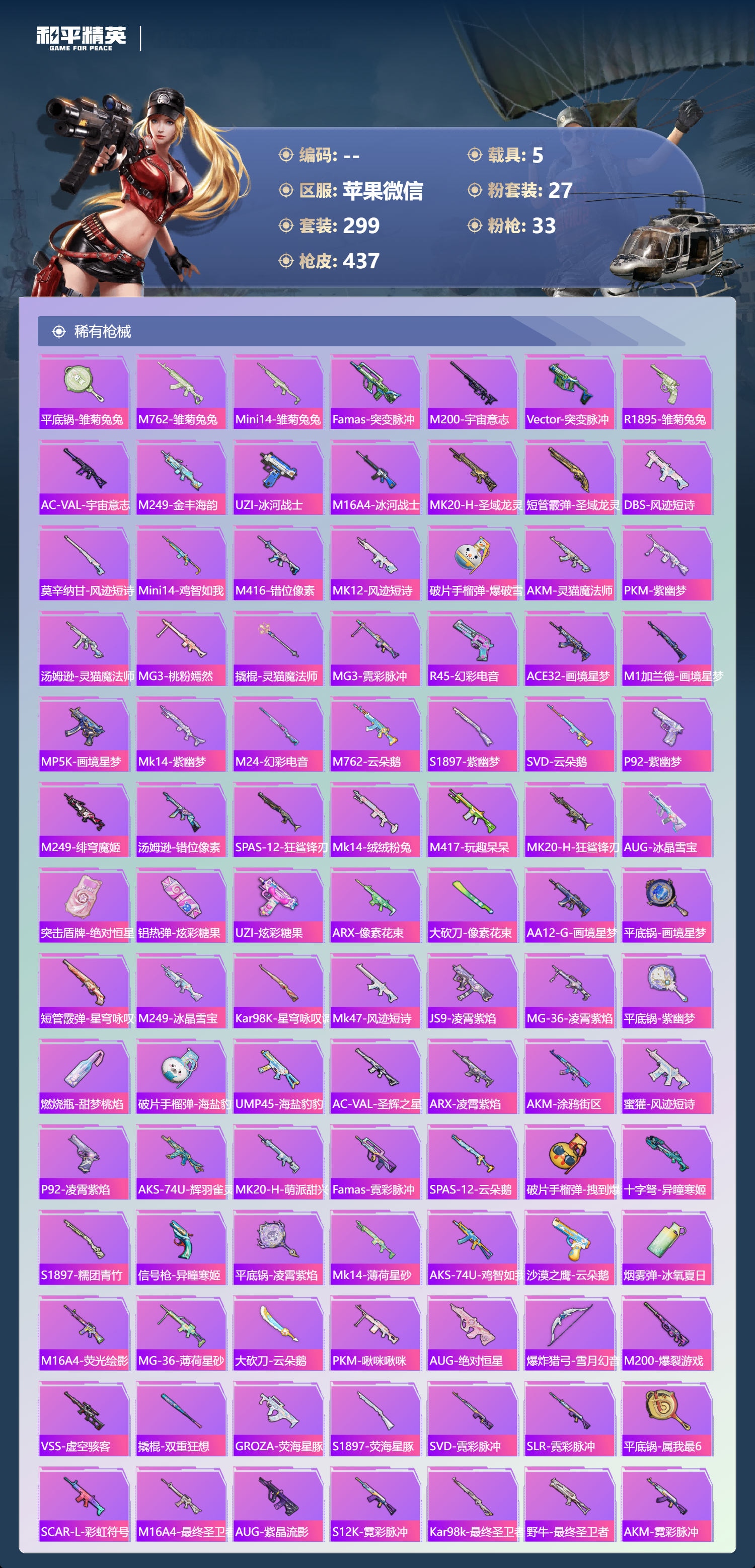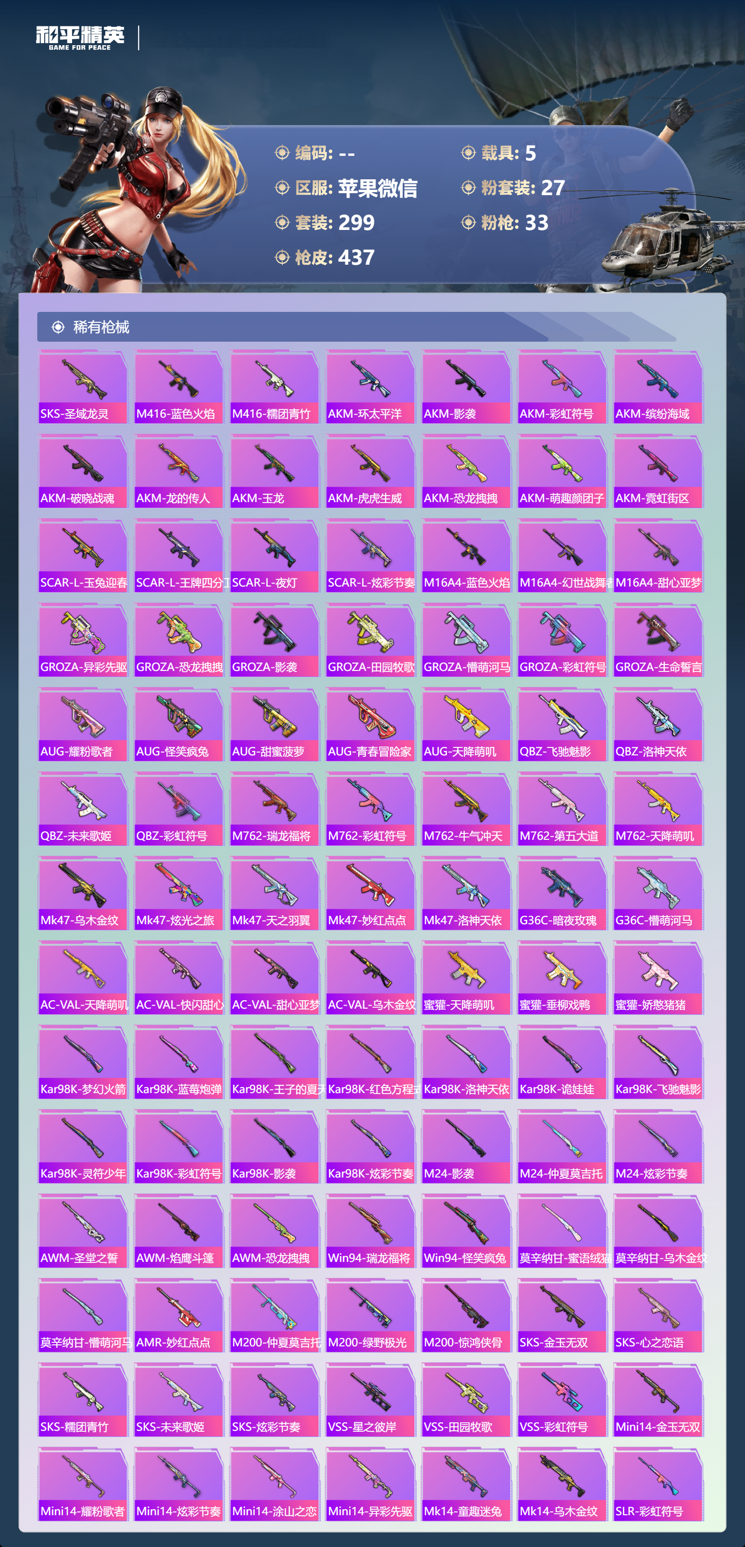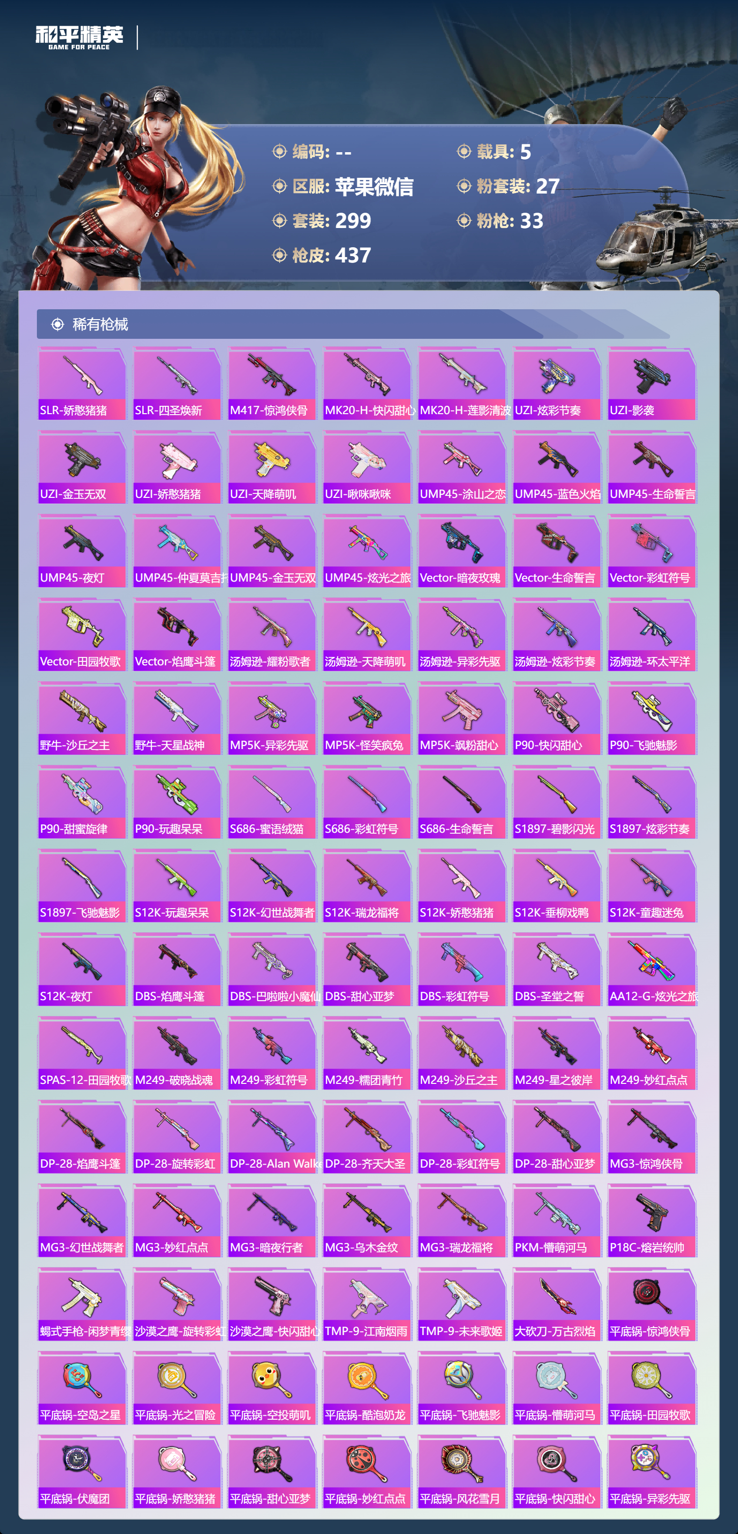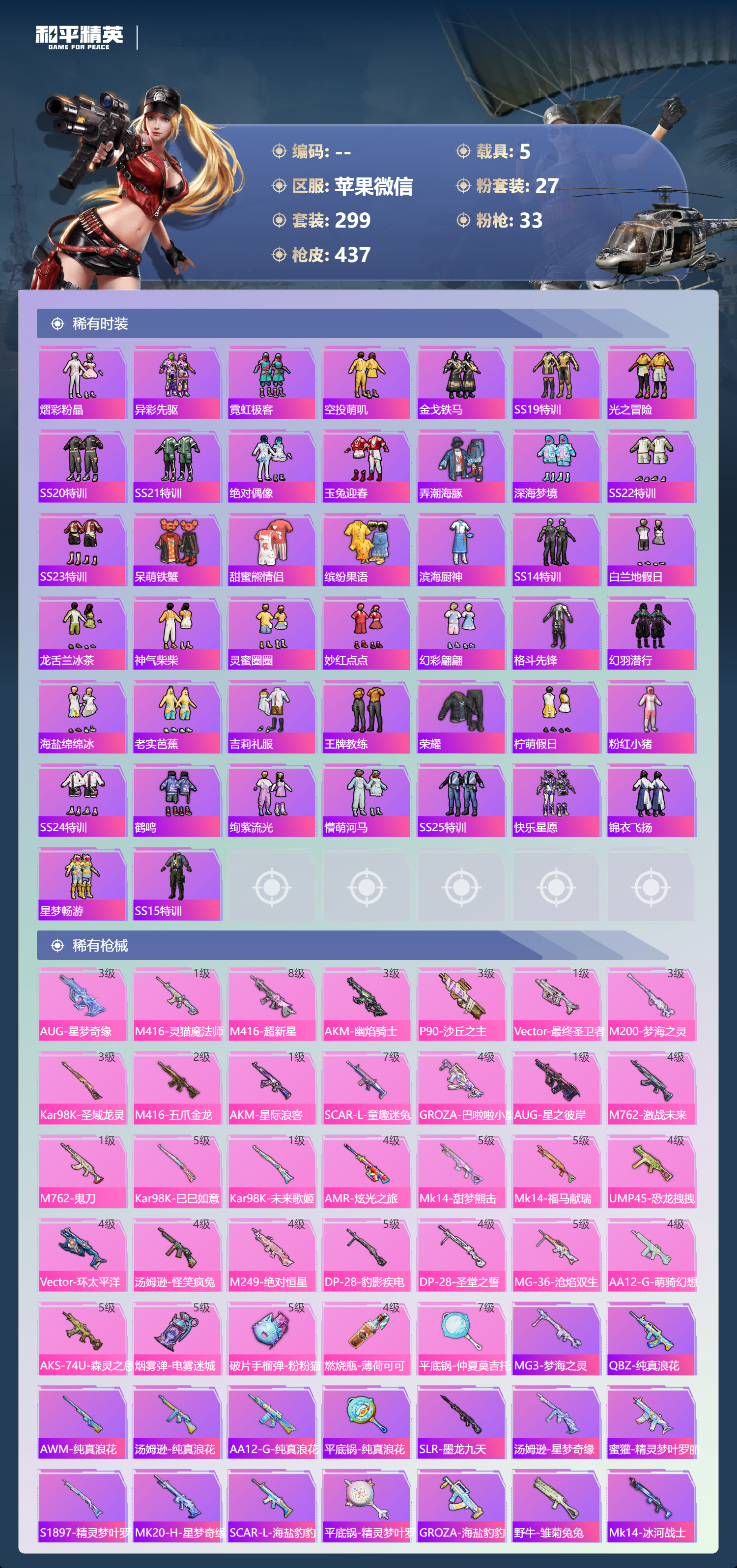 hs70644 苹果微信-22王牌印记-有战神框-1红装-27粉装-33特效枪-