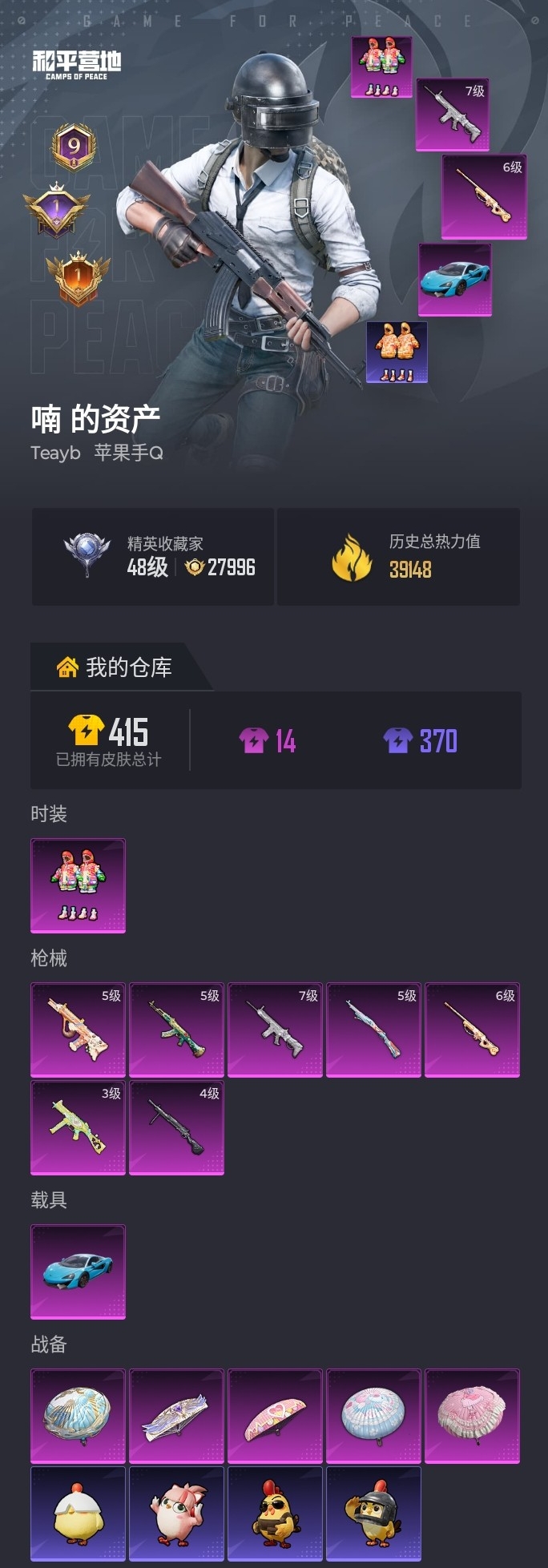 【小丑鱼7特效枪1载具1粉装 秒换绑不用等】 苹果Q区-39148热力值-96套装-117枪皮 【1载具】 迈凯伦570S(天际蓝)【1稀有】 AWM-黄金龙骨【1粉装】 炫光之旅【7特效枪】 UMP45-萌骑冒险(3级) SCAR-L-纯梦嫁纱(7级) AWM-橘柚倾心(6级) AKM-绿萝繁花(5级) Kar98K-巳巳如意(5级) AUG-暖羊咩咩(5级) DP-28-豹
