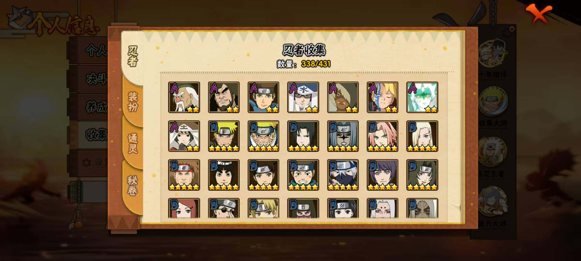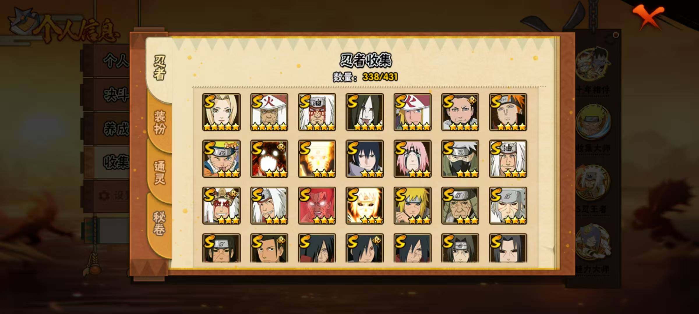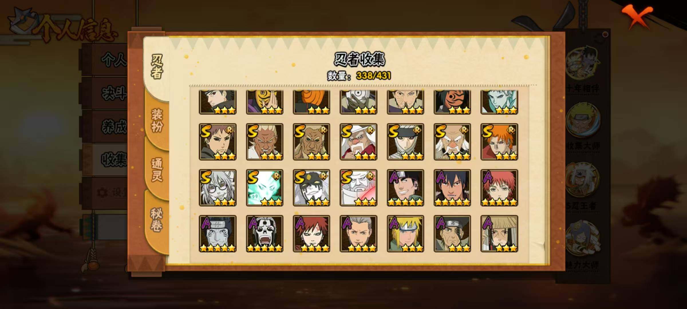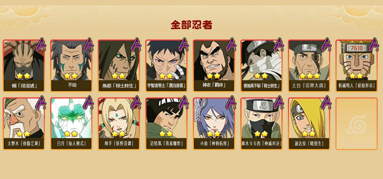 【S级忍者】:猿飞日斩「秽土转生」(3星),波风水门「秽土转生」(3星),千手扉间「秽土转生」(3星),千手柱间「秽土转生」(3星),宇智波鼬「秽土转生」(3星),宇智波斑「秽土转生」(3星),宇智波斑「秽土转生·解」(3星),大野木「忍界大战」(3星),春野樱「忍界大战」(3星),宇智波带土「忍界大战」(3星),艾「忍界大战」(3星),宇智波鼬「须佐能乎」(3星),宇智波止水「须佐能乎」(3星),旗木卡卡西「须佐能乎」(3星),宇智波斑「木叶创立」(3星),千手