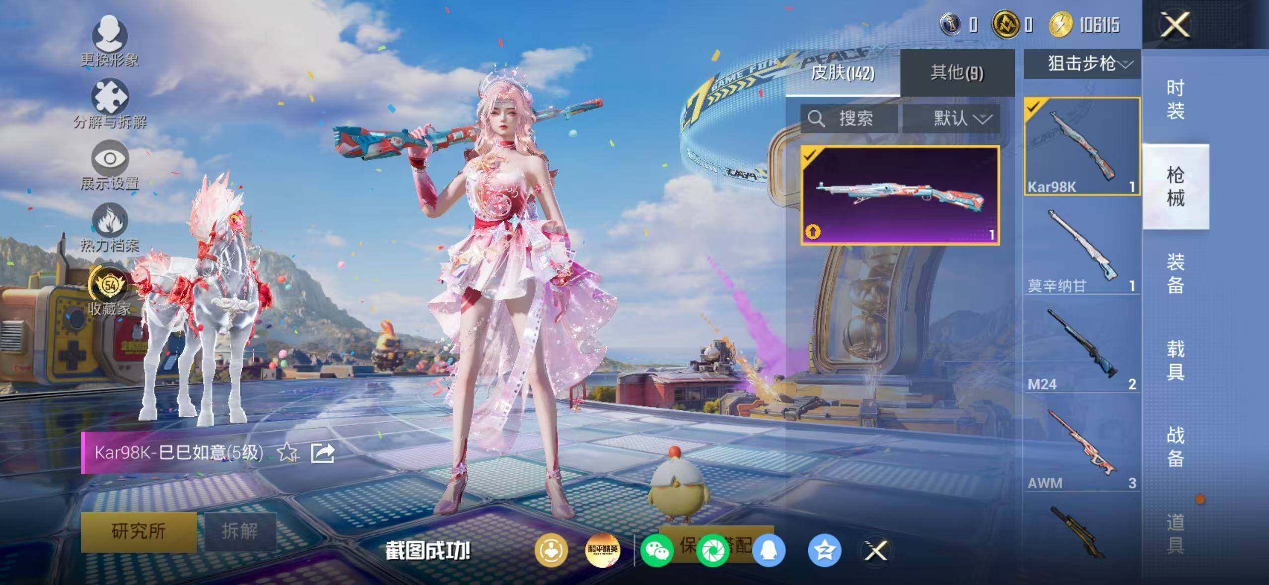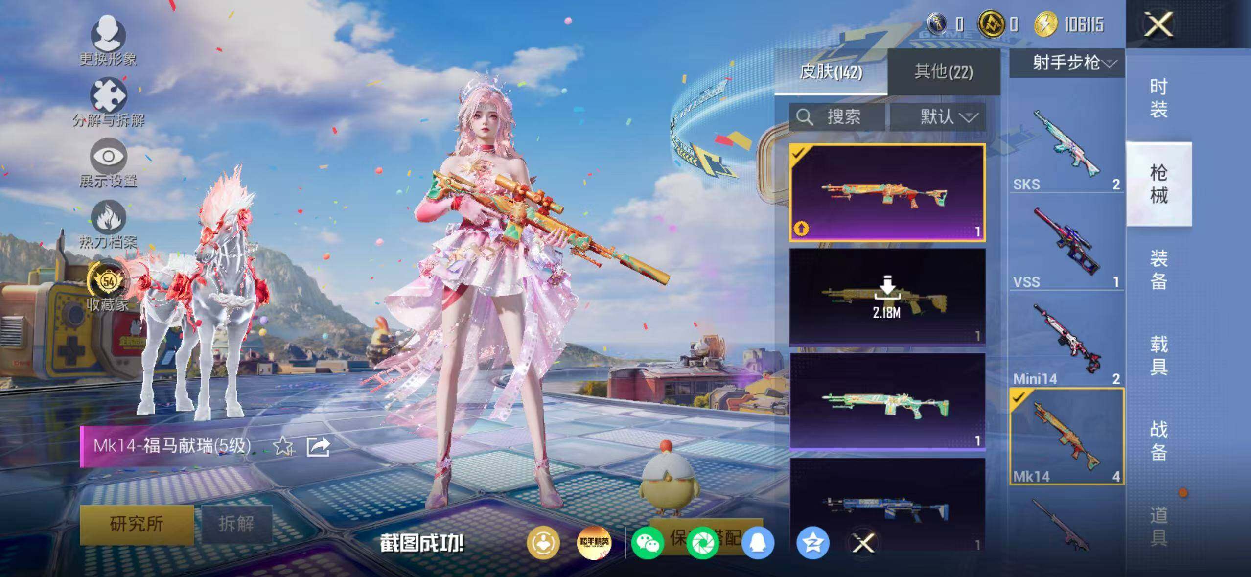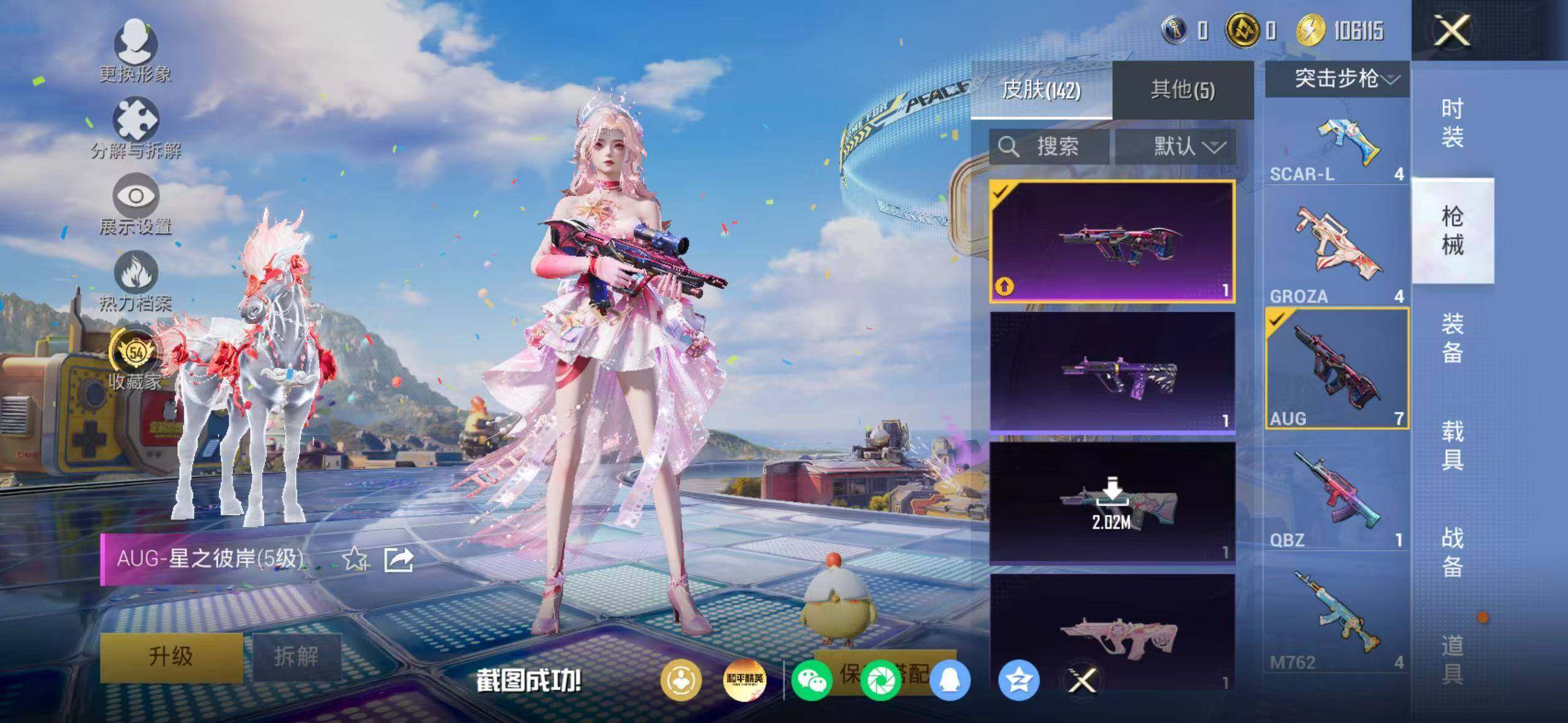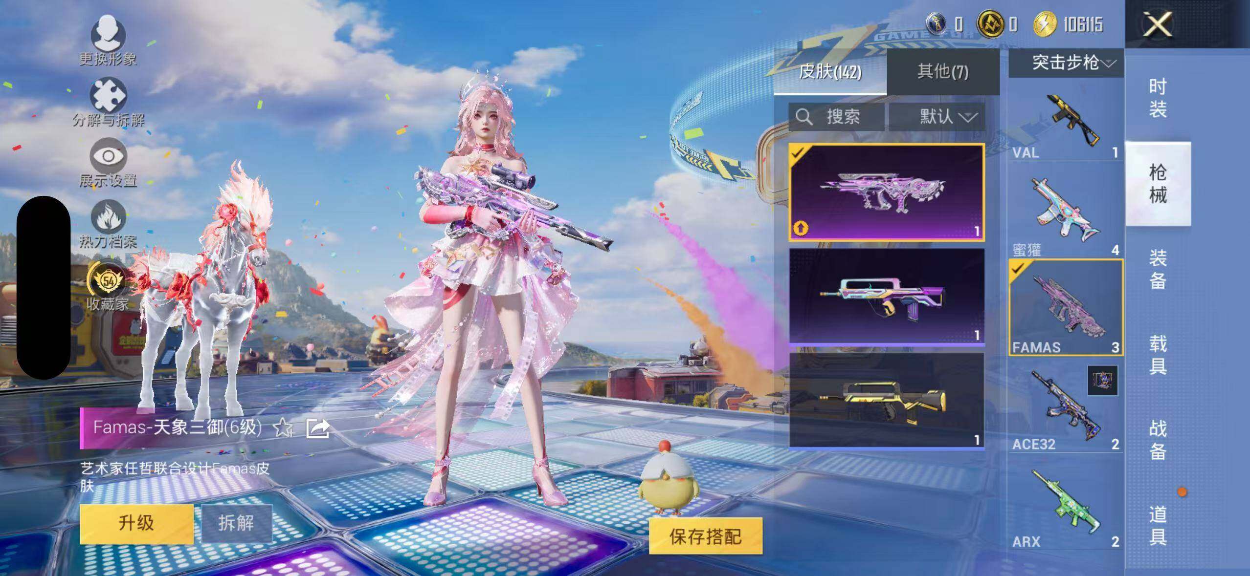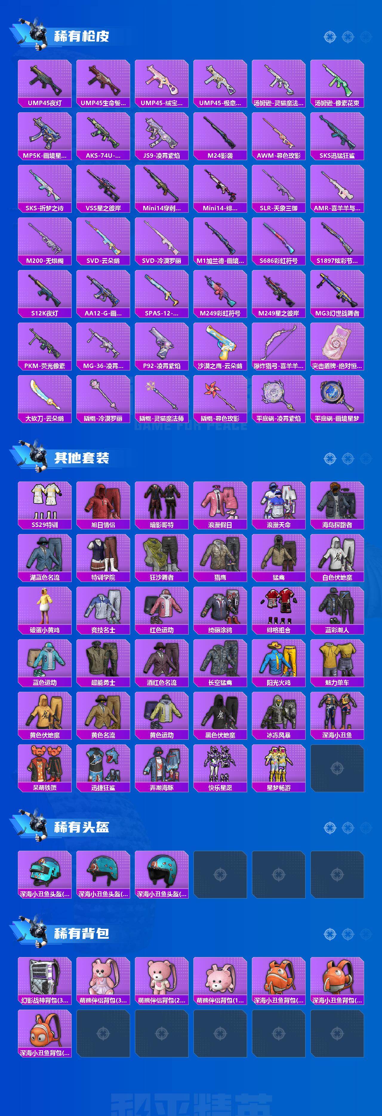 91套装/枪械9/装备179/载具2/战备104/王牌印记5/热力值40984/五级AUG-星之彼岸/六级Famas-天象三御/五级AKS-74U-森灵之息/五级Kar98K-巳巳如意/五级Mk14-福马献瑞/二级AA12-G-萌骑幻想/五级M249-绝对恒星/五级DP-28-豹影疾电/五级MG-36-沧焰双生/套装-浪漫天命/深海小丑鱼/小丑鱼/套装-暗影哥特/角色-绝对恒星/星之彼岸/角色-