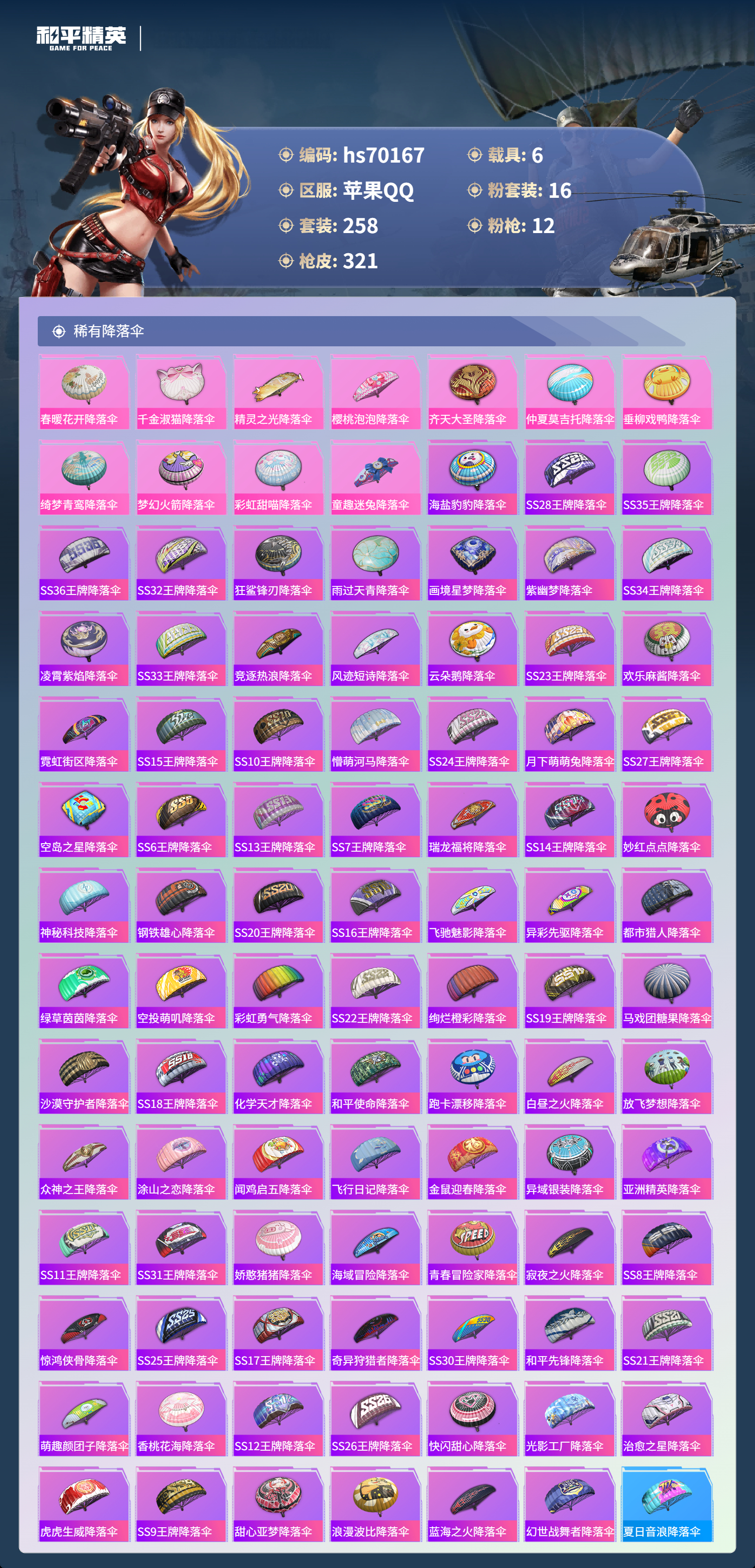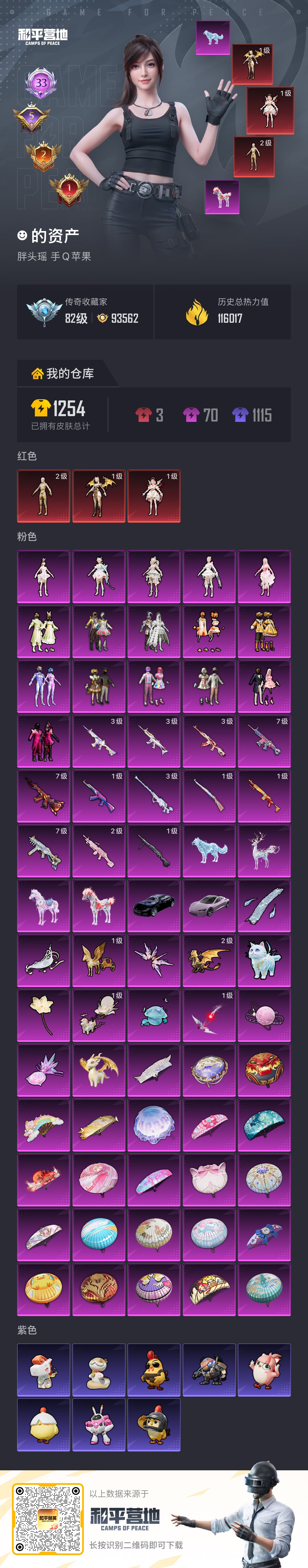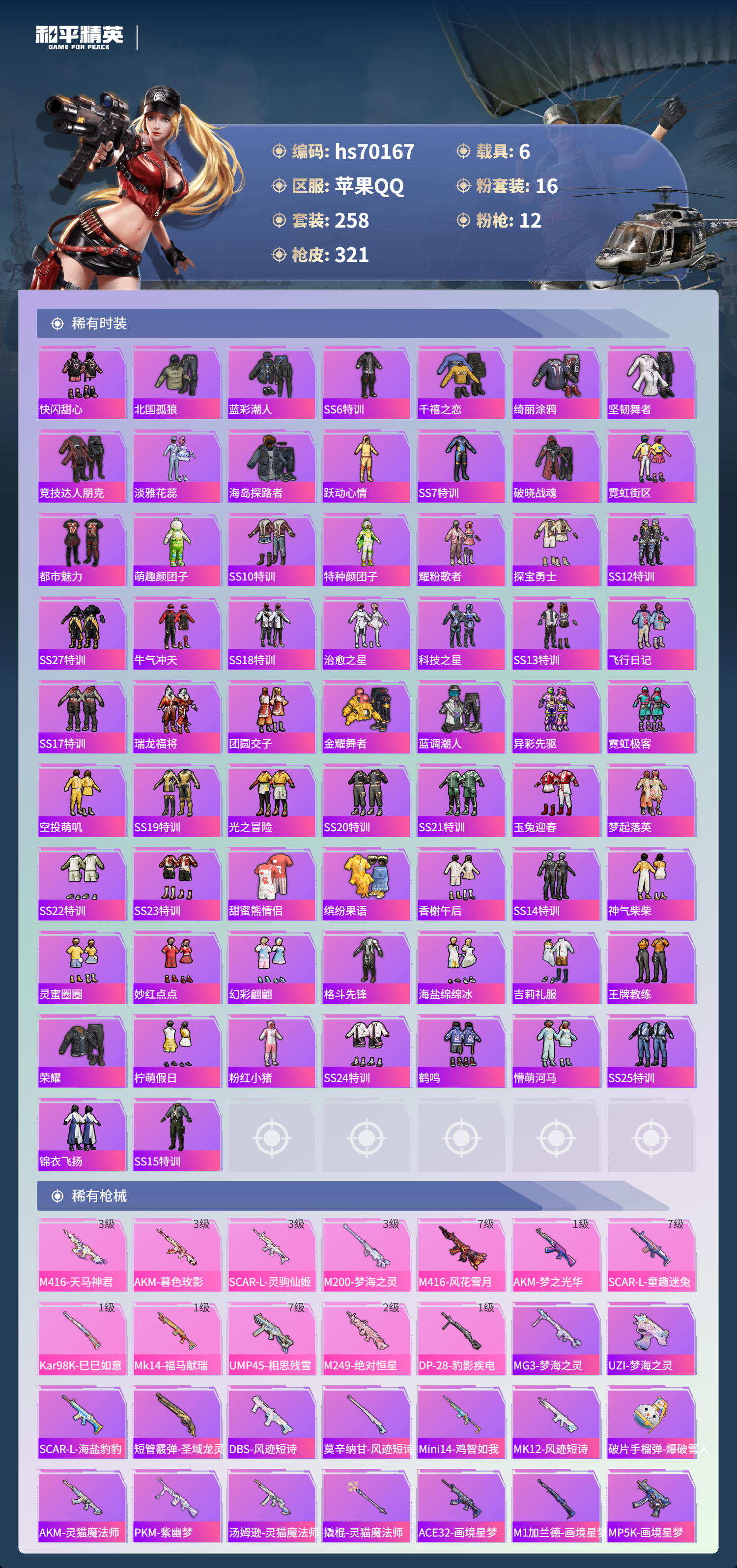 hs70167 苹果手Q-33王牌印记-有战神框-3红装-16粉装-12特效枪-6载具-热力值-258套装-321枪皮-5卓越印记-2传奇印记